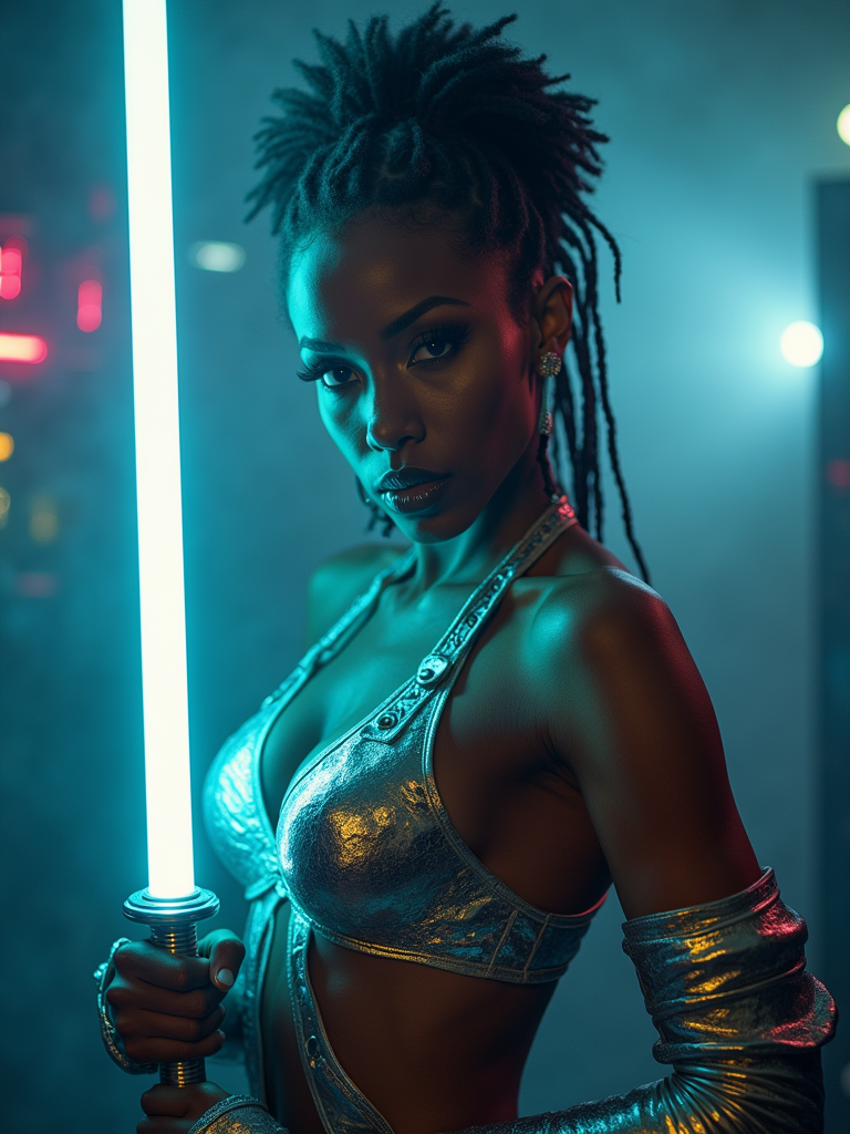 Galactic fantasy scene of model in metallic silver and black space-themed lingerie, holding a glowing glowing sci-fi energy sword. She poses in a smoky, dimly lit room filled with sci-fi props and glowing tech elements. Her confident warrior stance and sharp expression give her an interstellar dominatrix vibe.