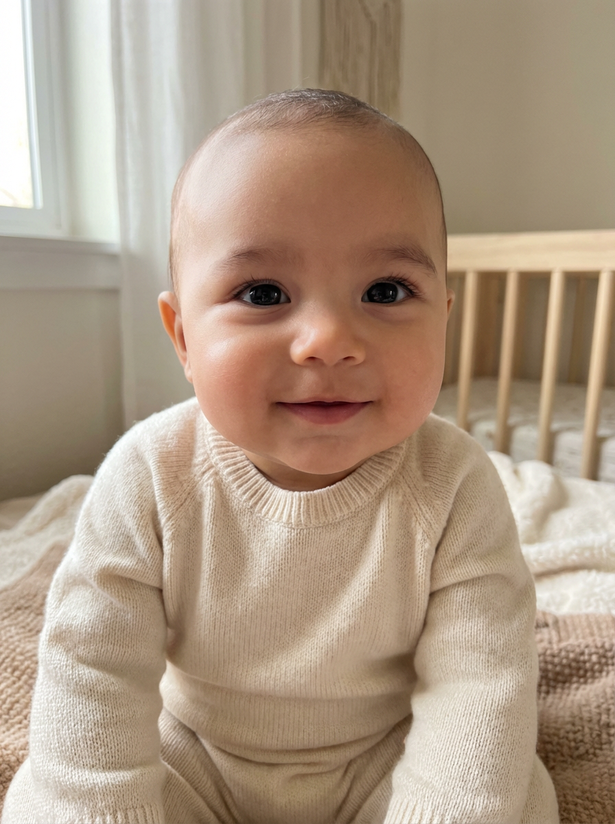 generate a close up of a baby how it would look if mans had a baby, beautiful infant face showing blended characteristics, smooth baby complexion, expressive eyes, gentle smile, natural portrait lighting