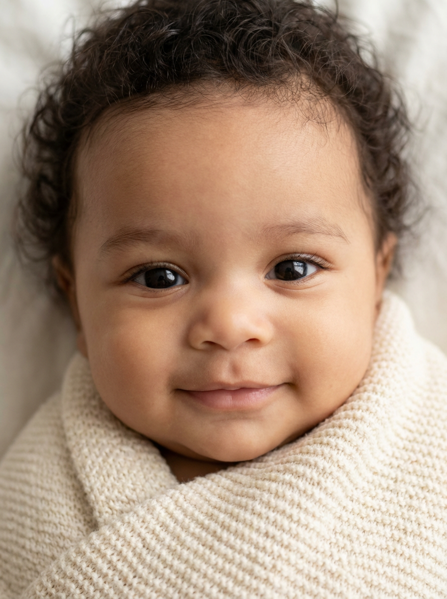generate a close up of a baby how it would look if mans had a baby, beautiful infant face showing blended characteristics, smooth baby complexion, expressive eyes, gentle smile, natural portrait lighting