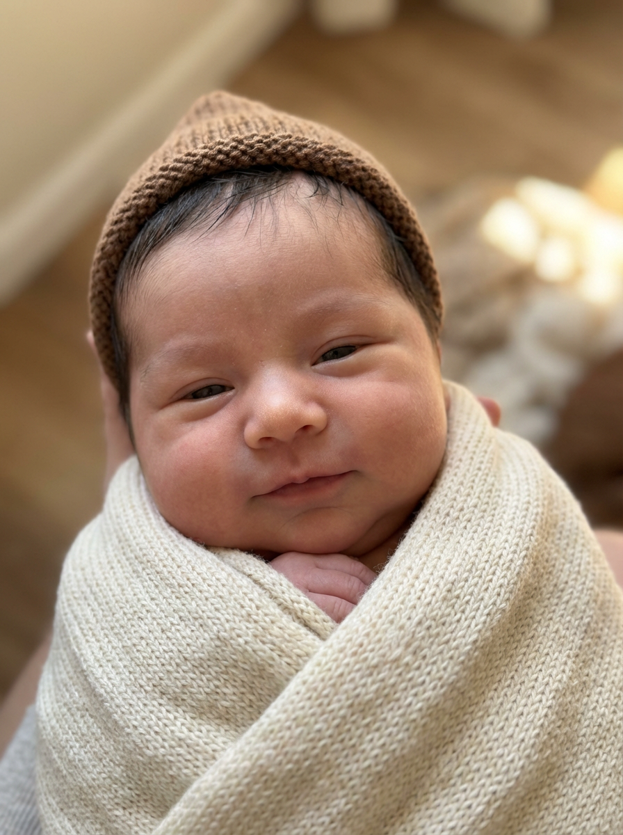 generate a close up of a baby how it would look if mans had a baby, cute newborn portrait with combined facial features, chubby baby cheeks, tiny button nose, content expression, warm soft lighting