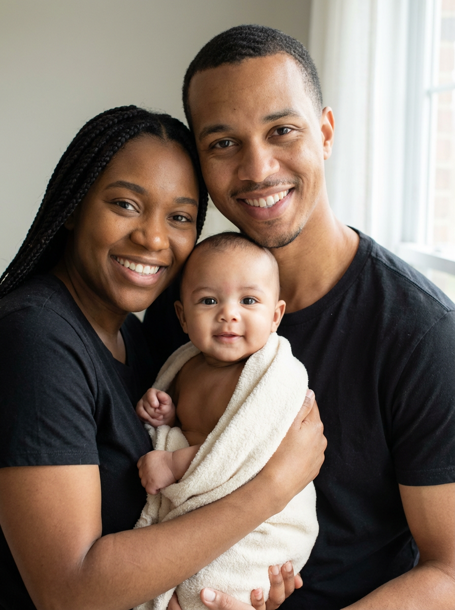 generate a close up of a baby how it would look if mans had a baby, father holding baby with mother beside them smiling, beautiful infant face showing blended characteristics, smooth baby complexion, expressive eyes, gentle smile, natural portrait lighting