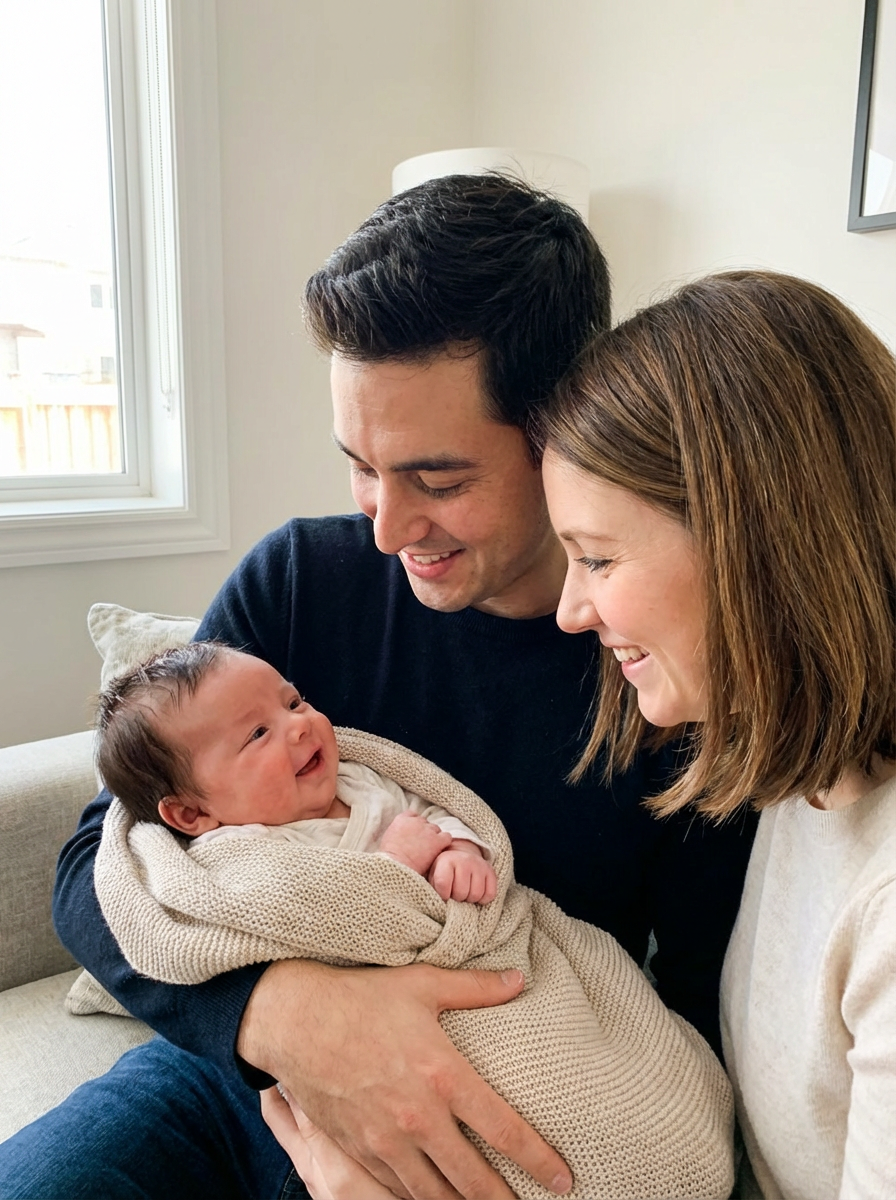 generate a close up of a baby how it would look if mans had a baby, with father holding baby and mother next to them both looking at baby, precious baby face with inherited features, rosy cheeks, small delicate features, happy gurgling expression, soft natural light