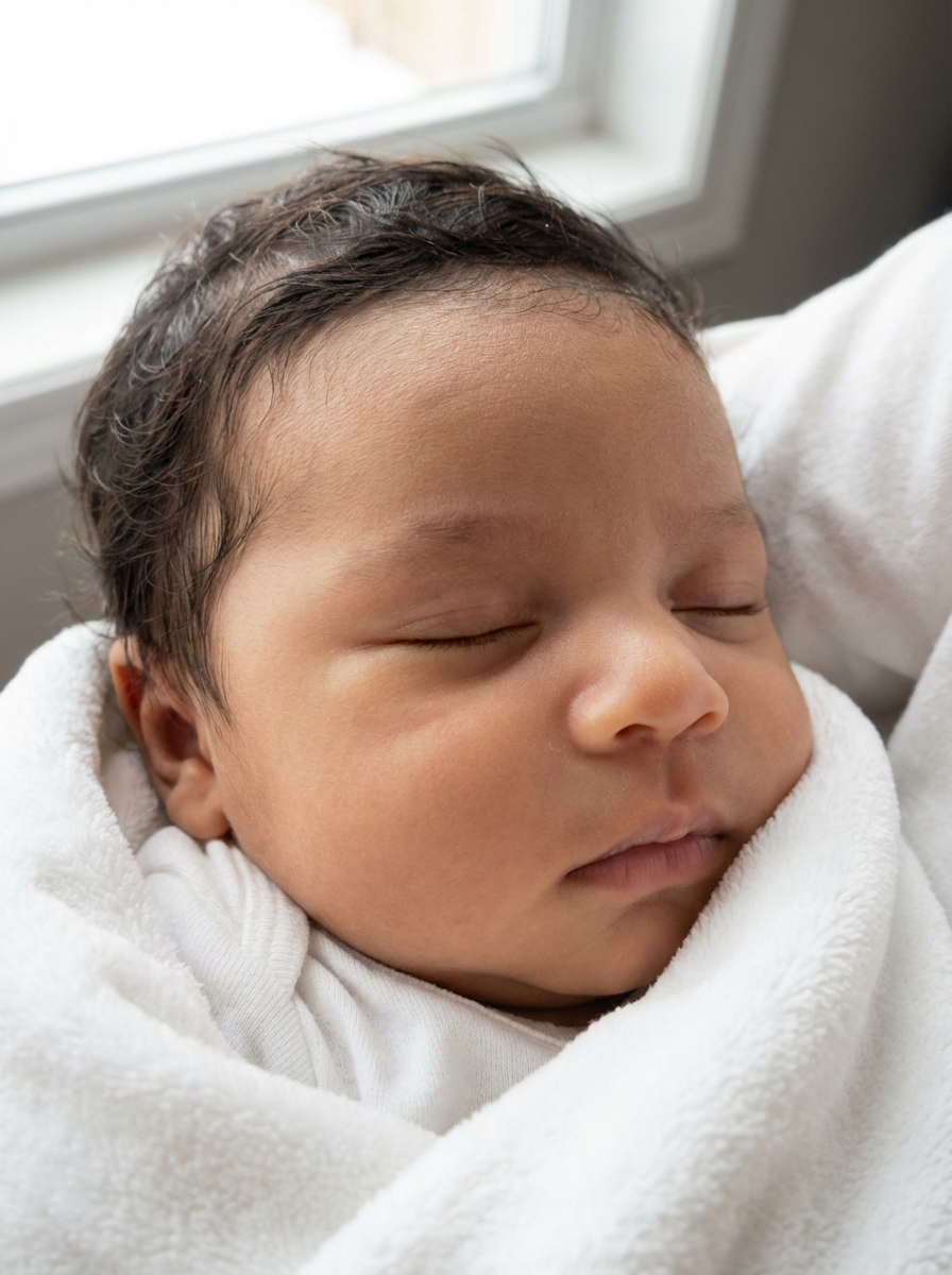 generate a close up of a baby how it would look if womans had a baby, adorable infant face with mixed features, soft baby skin, bright curious eyes, peaceful sleeping expression, natural lighting