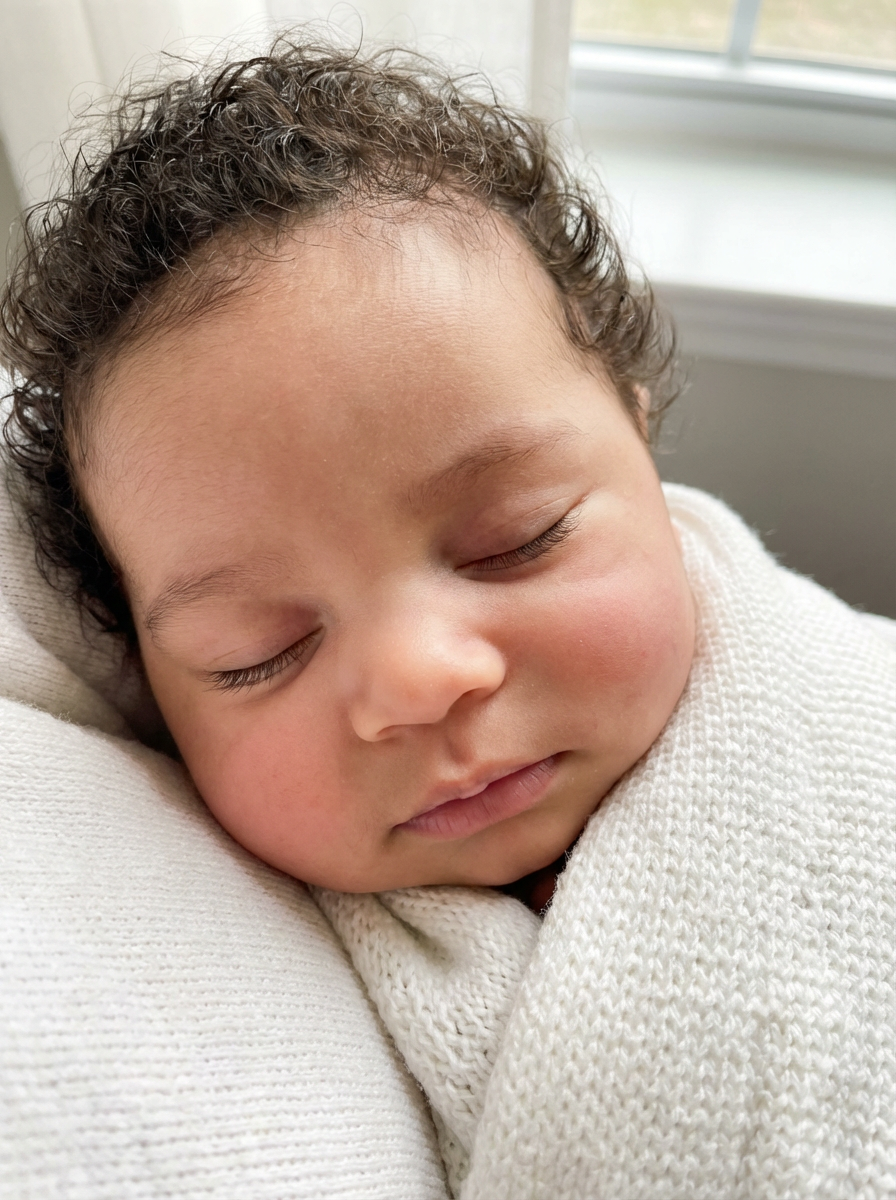 generate a close up of a baby how it would look if womans had a baby, adorable infant face with mixed features, soft baby skin, bright curious eyes, peaceful sleeping expression, natural lighting