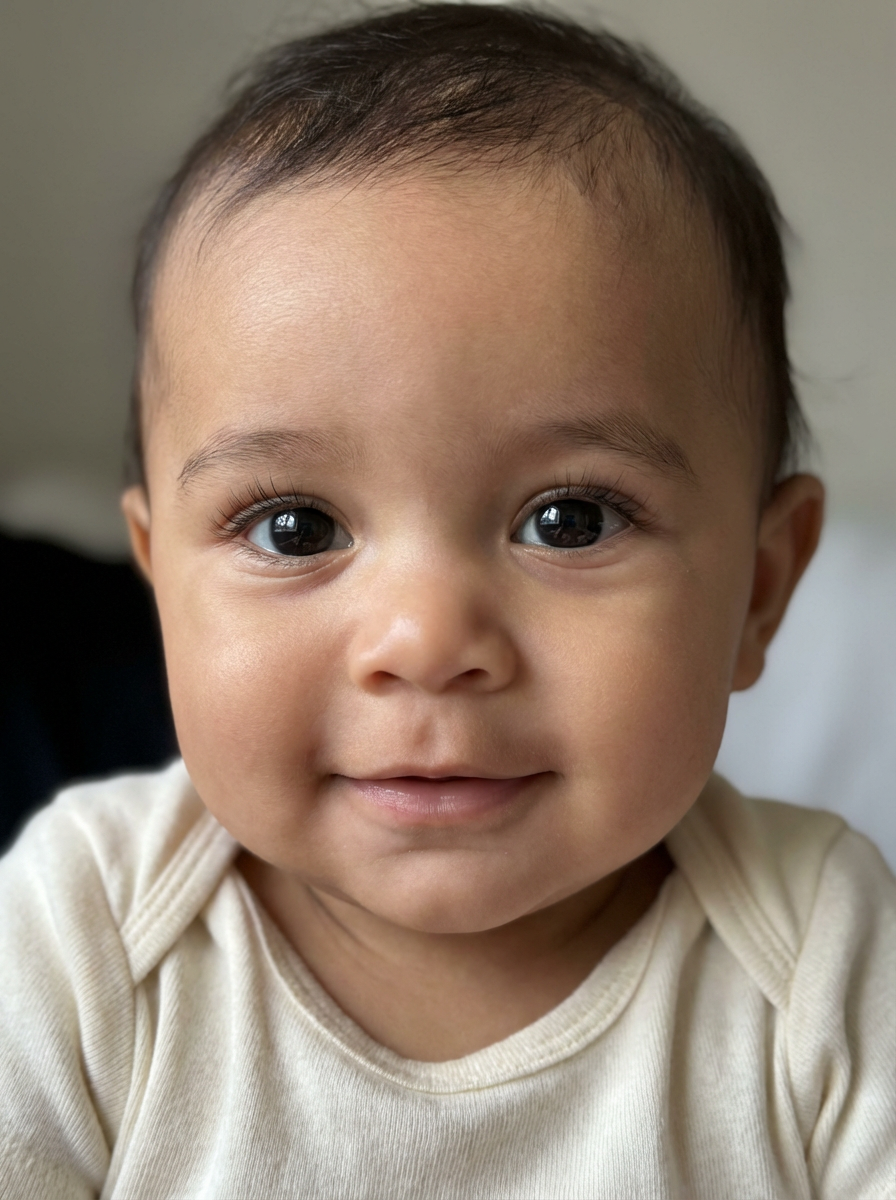 generate a close up of a baby how it would look if womans had a baby, beautiful infant face showing blended characteristics, smooth baby complexion, expressive eyes, gentle smile, natural portrait lighting