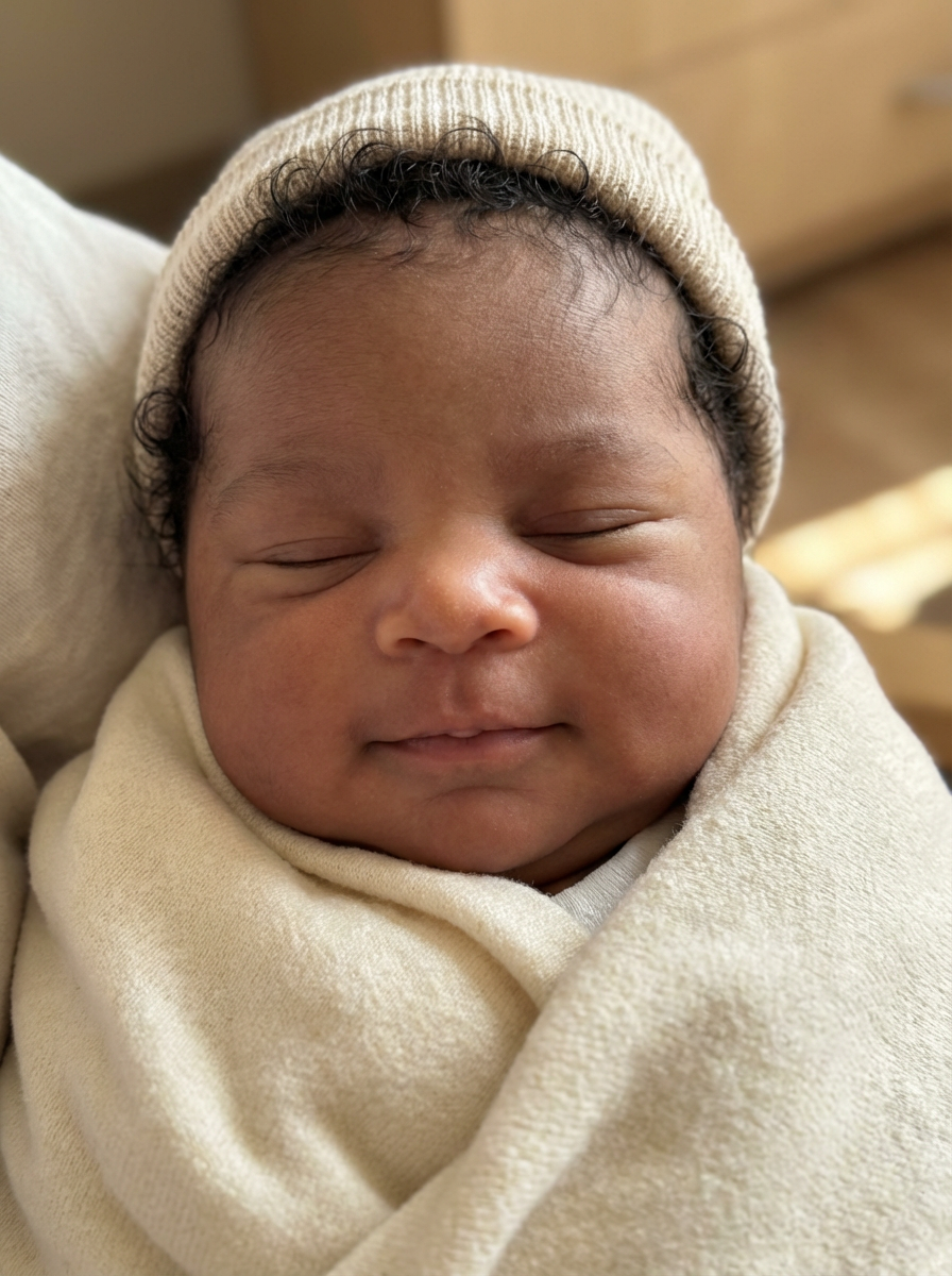generate a close up of a baby how it would look if womans had a baby, cute newborn portrait with combined facial features, chubby baby cheeks, tiny button nose, content expression, warm soft lighting