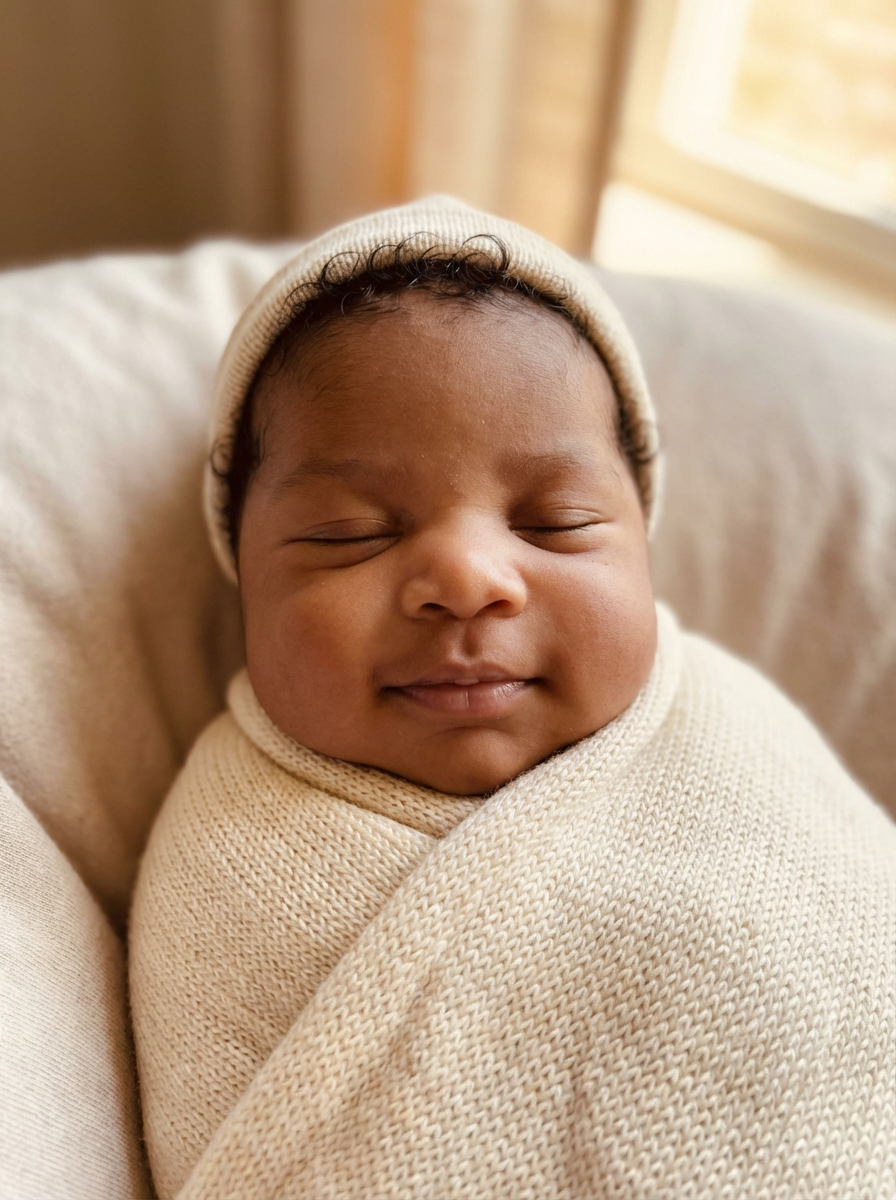 generate a close up of a baby how it would look if womans had a baby, cute newborn portrait with combined facial features, chubby baby cheeks, tiny button nose, content expression, warm soft lighting