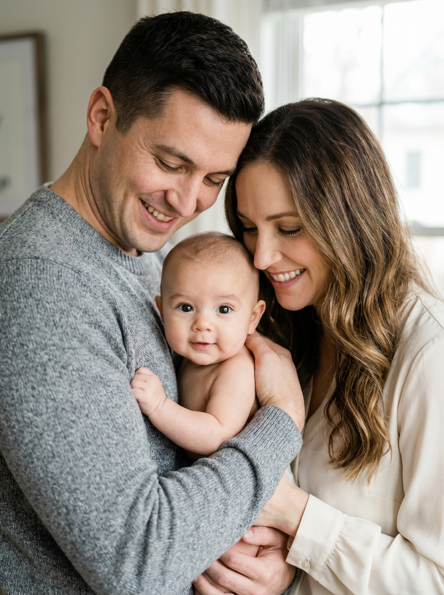 generate a close up of a baby how it would look if womans had a baby, father holding baby with mother beside them smiling, beautiful infant face showing blended characteristics, smooth baby complexion, expressive eyes, gentle smile, natural portrait lighting