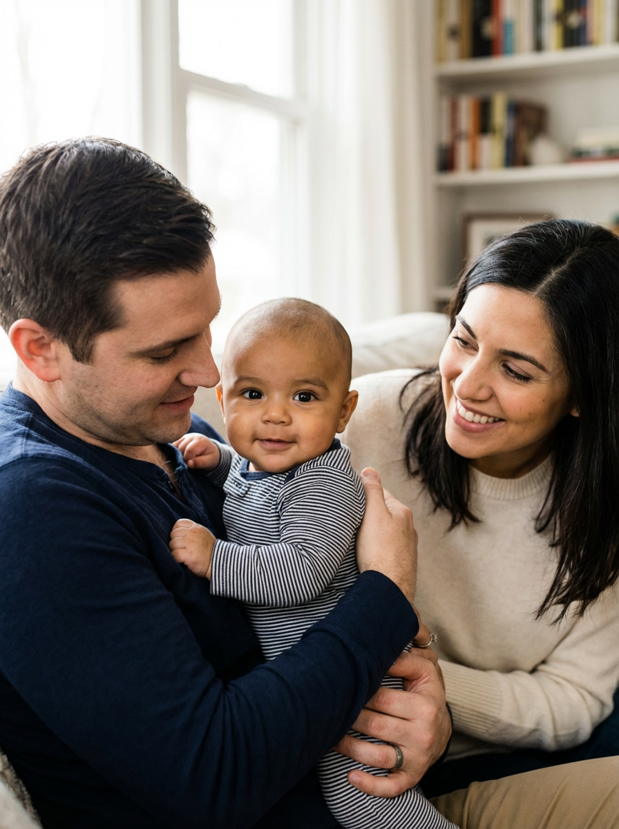 generate a close up of a baby how it would look if womans had a baby, father holding baby with mother beside them smiling, beautiful infant face showing blended characteristics, smooth baby complexion, expressive eyes, gentle smile, natural portrait lighting