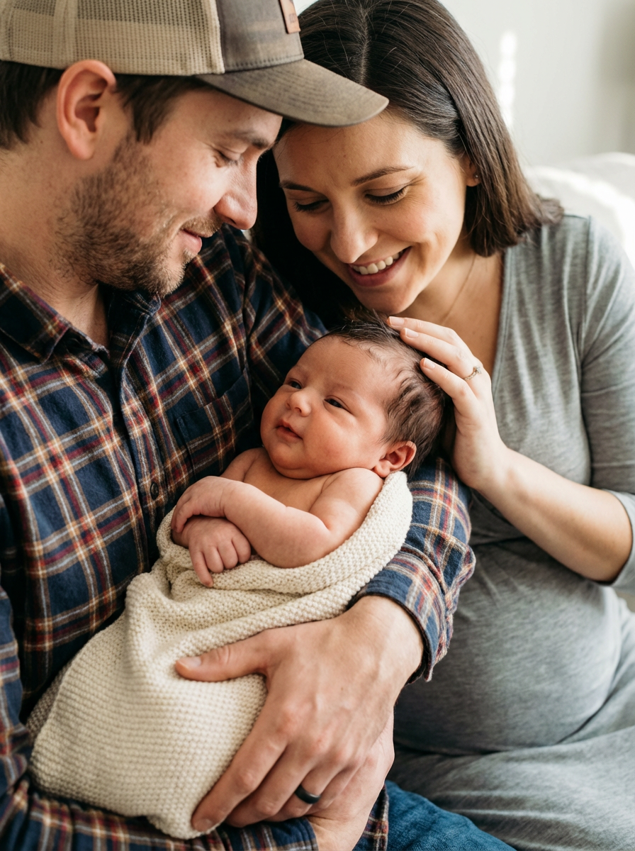 generate a close up of a baby how it would look if womans had a baby, father holding baby with mother beside them smiling, beautiful infant face showing blended characteristics, smooth baby complexion, expressive eyes, gentle smile, natural portrait lighting