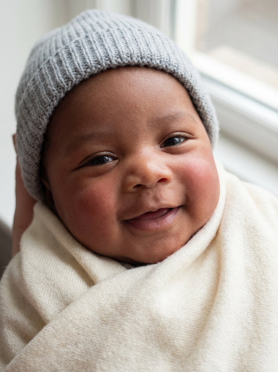 generate a close up of a baby how it would look if womans had a baby, precious baby face with inherited features, rosy cheeks, small delicate features, happy gurgling expression, soft natural light
