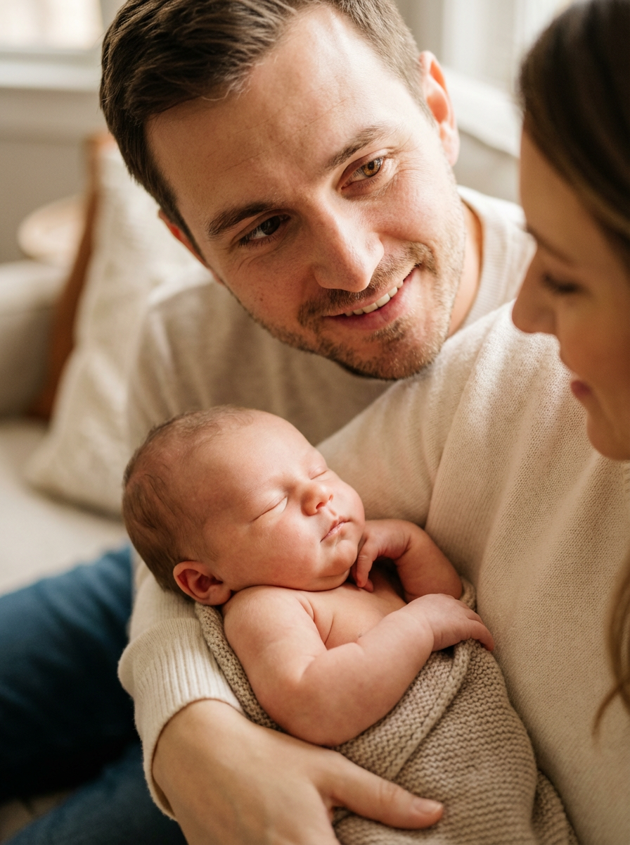 generate a close up of a baby how it would look if womans had a baby, with mother cradling baby while father looks on lovingly, cute newborn portrait with combined facial features, chubby baby cheeks, tiny button nose, content expression, warm soft lighting