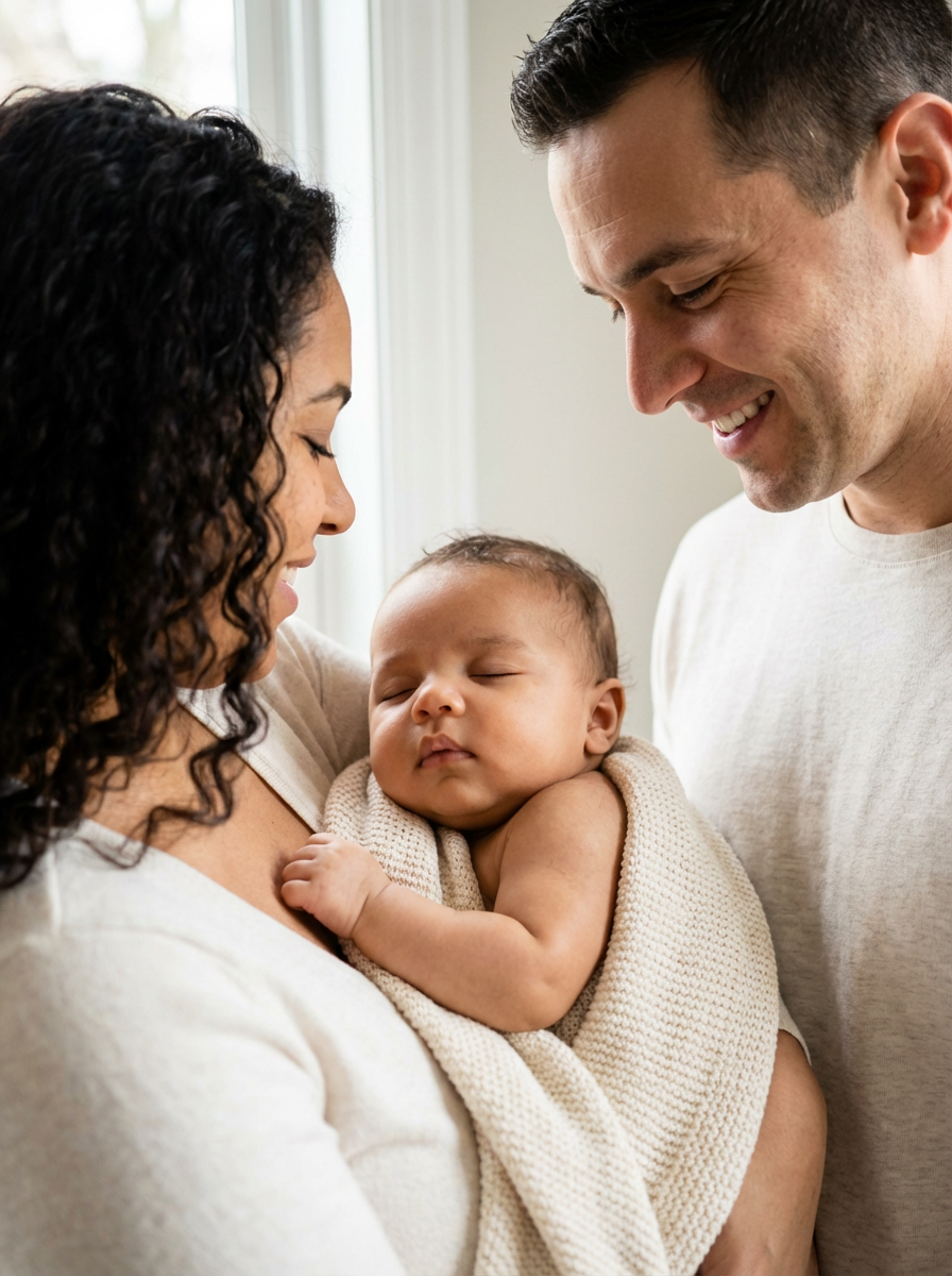 generate a close up of a baby how it would look if womans had a baby, with mother holding baby and father standing next to them, adorable infant face with mixed features, soft baby skin, bright curious eyes, peaceful sleeping expression, natural lighting