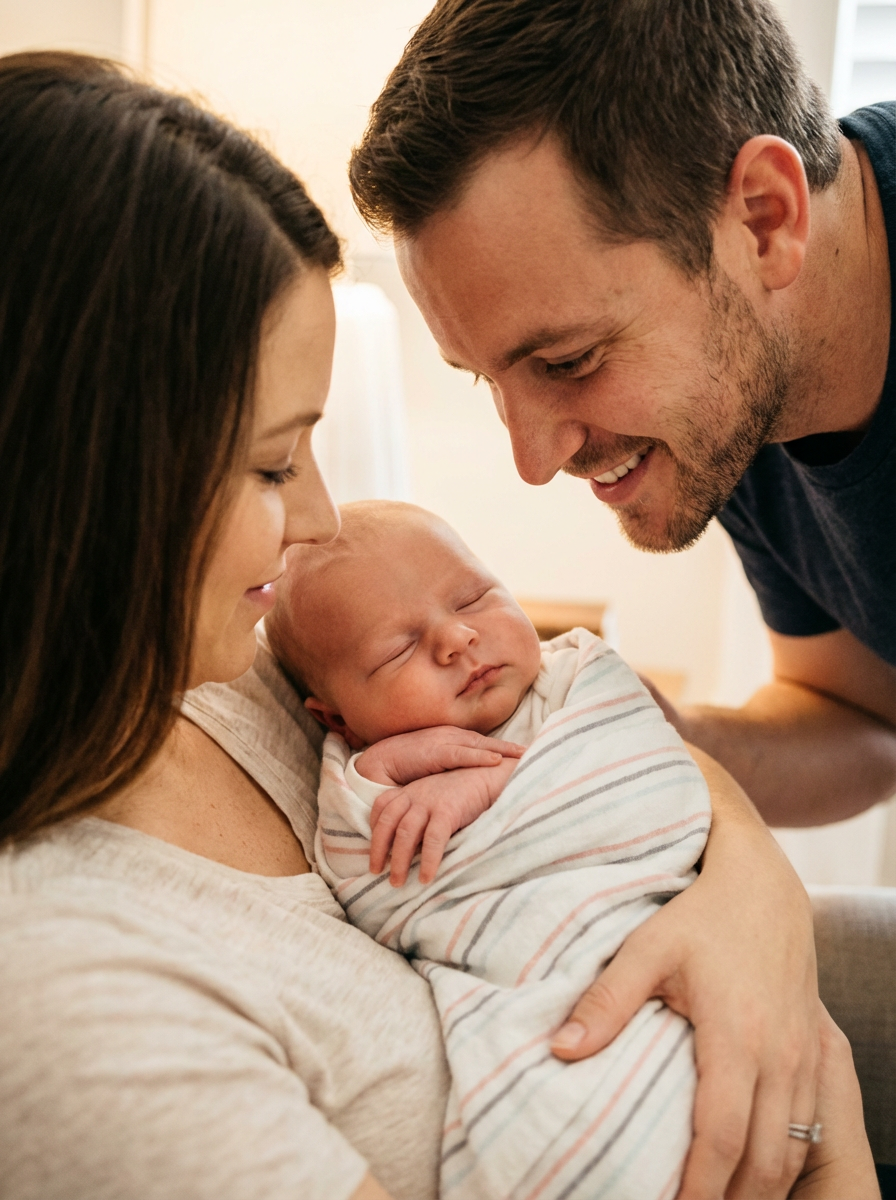 generate a close up of a baby how it would look if womans had a baby, with mother cradling baby while father looks on lovingly, cute newborn portrait with combined facial features, chubby baby cheeks, tiny button nose, content expression, warm soft lighting