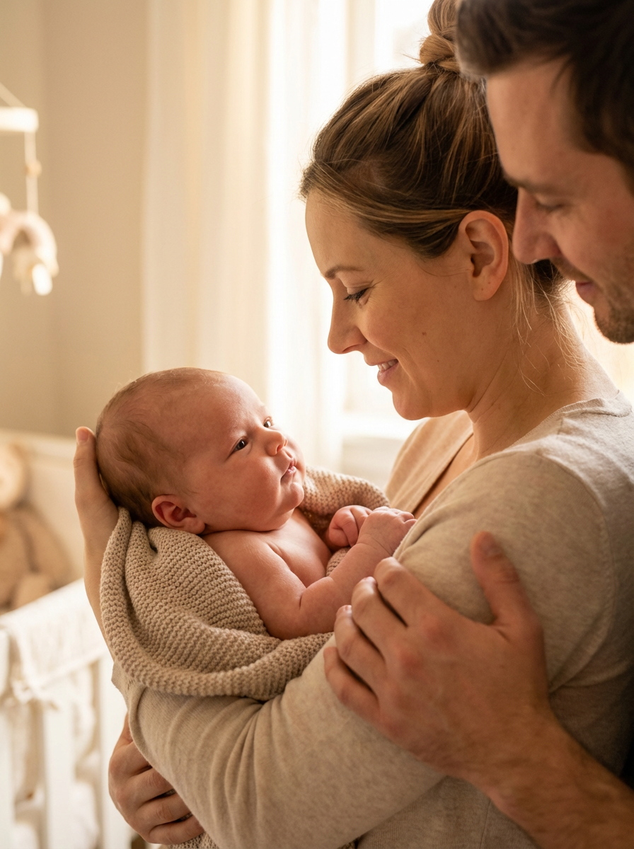 generate a close up of a baby how it would look if womans had a baby, with mother cradling baby while father looks on lovingly, cute newborn portrait with combined facial features, chubby baby cheeks, tiny button nose, content expression, warm soft lighting