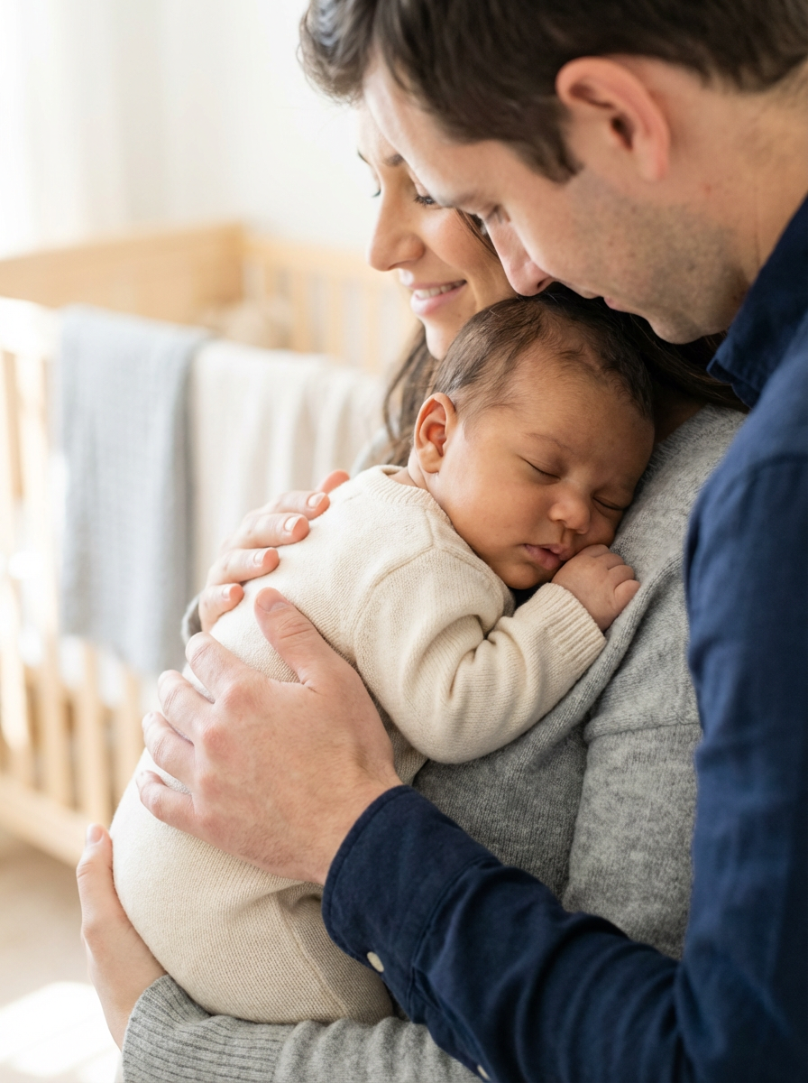 generate a close up of a baby how it would look if womans had a baby, with mother holding baby and father standing next to them, adorable infant face with mixed features, soft baby skin, bright curious eyes, peaceful sleeping expression, natural lighting