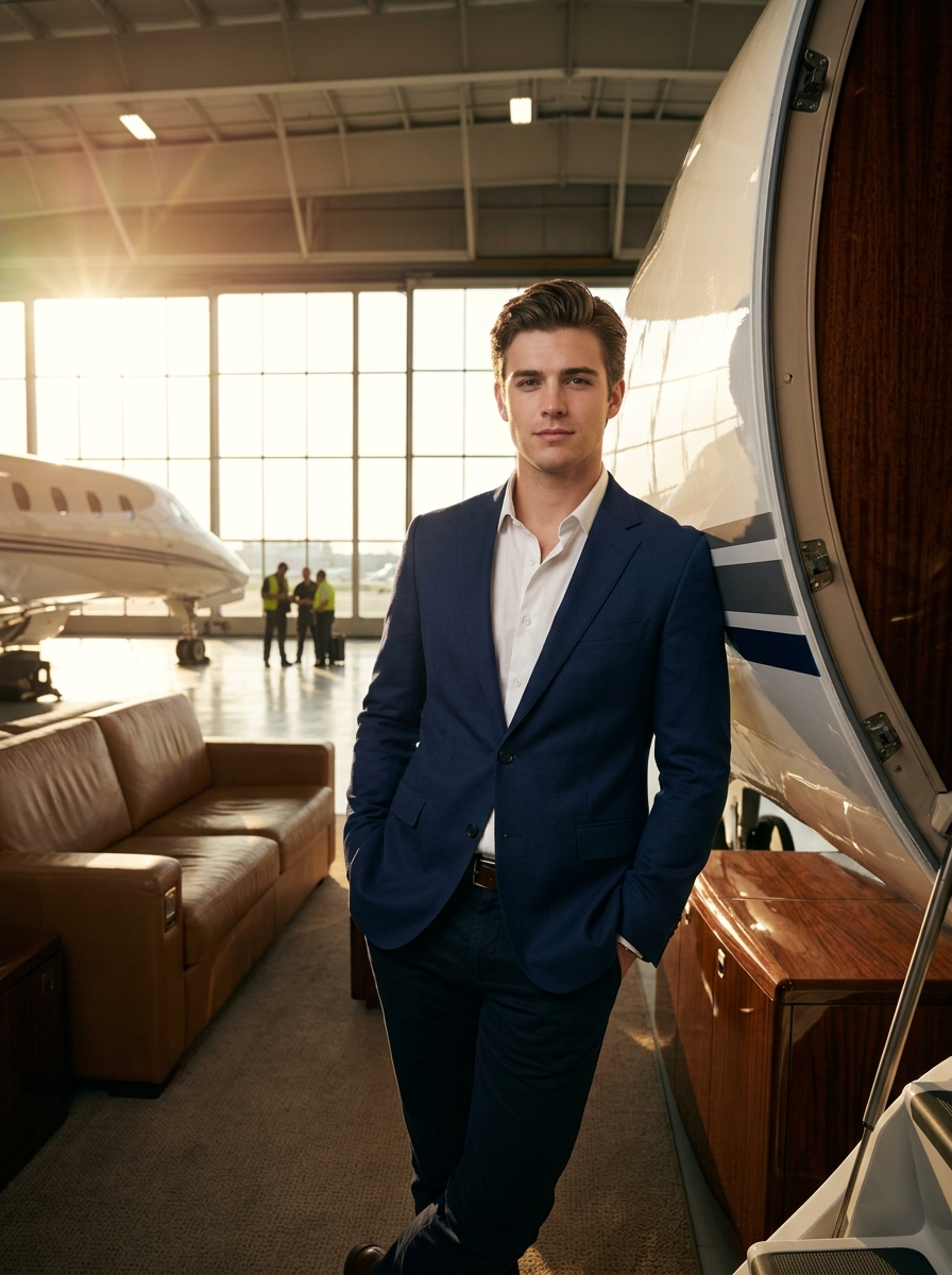 Generate a high-end cinematic portrait of a confident young model in a luxury aviation setting.