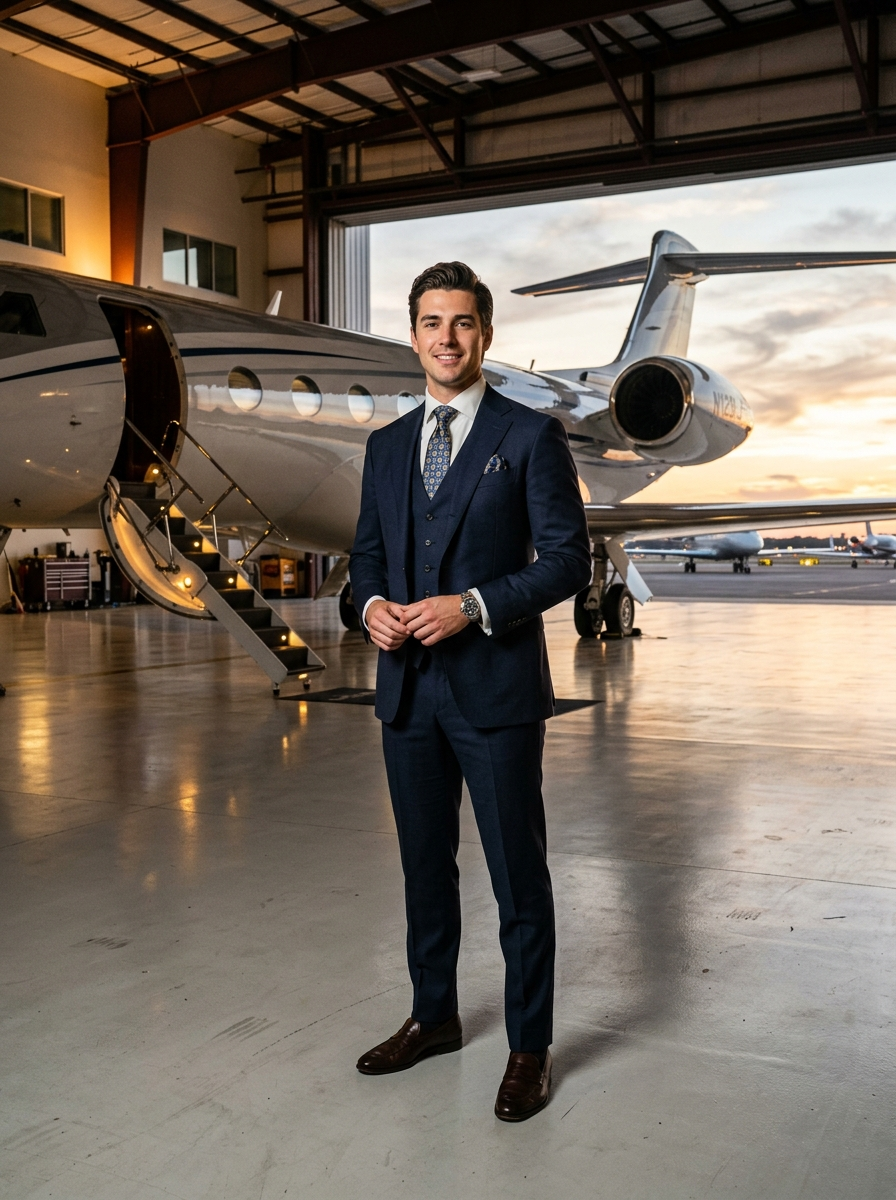 Generate a high-end cinematic portrait of a confident young model in a luxury aviation setting.