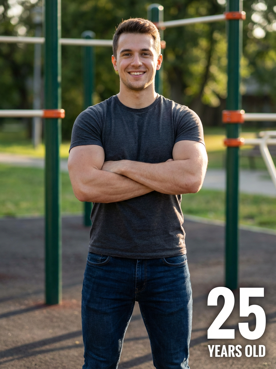 generate model at age 25 if model stays fit and muscle and healthy and clean diet healthy, add age label in bottom right 25 years old