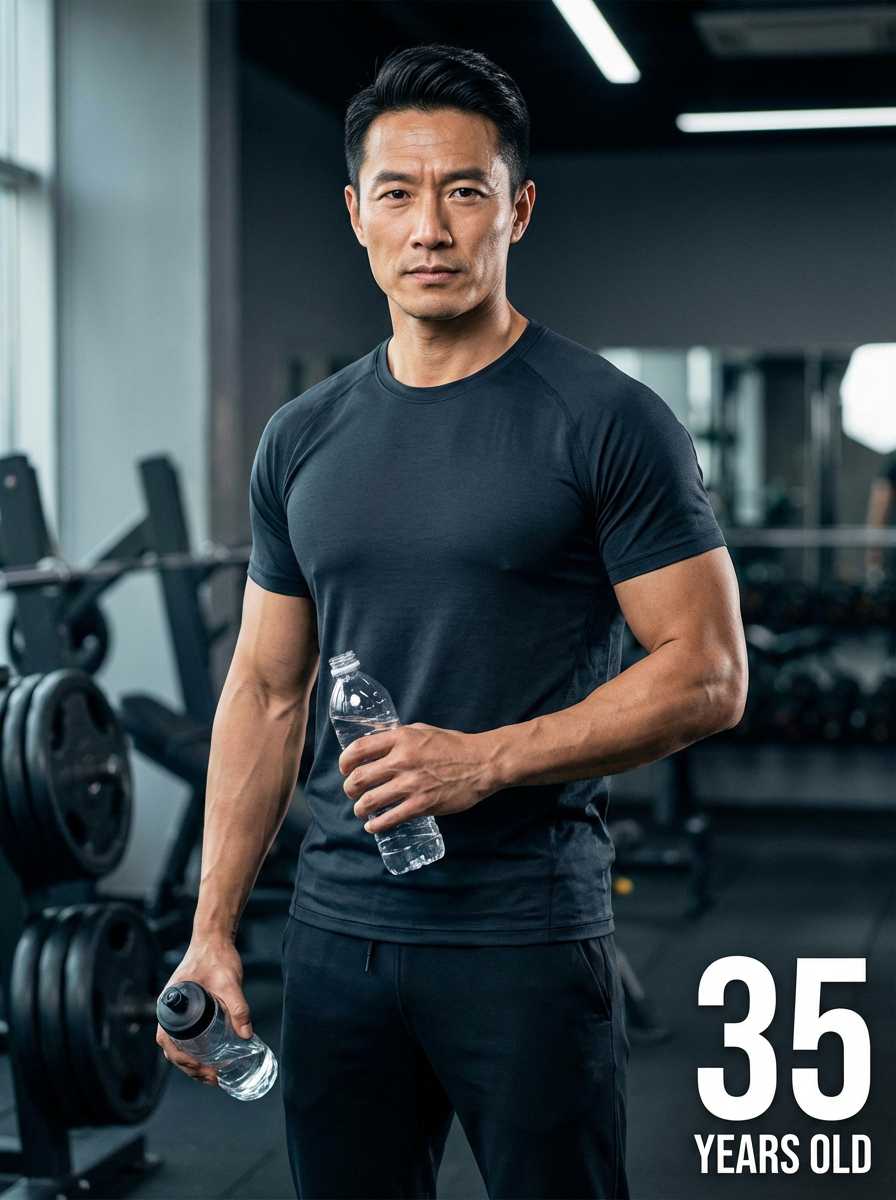 generate model at age 35 if model stays fit and muscle and healthy and clean diet healthy, add age label in bottom right 35 years old