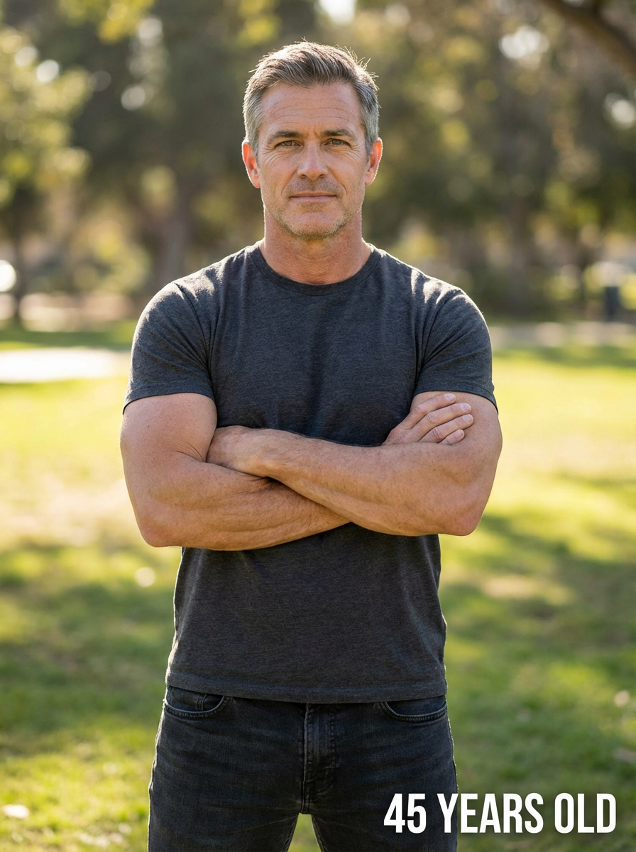 generate model at age 45 if model stays fit and muscle and healthy and clean diet healthy, add age label in bottom right 45 years old