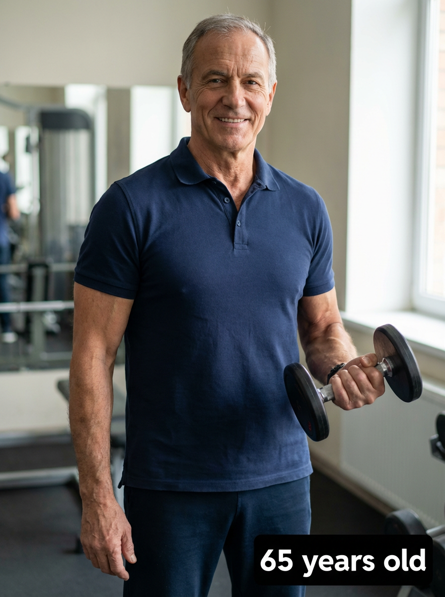 generate model at age 65 if model stays fit and muscle and healthy and clean diet healthy, add age label in bottom right 65 years old