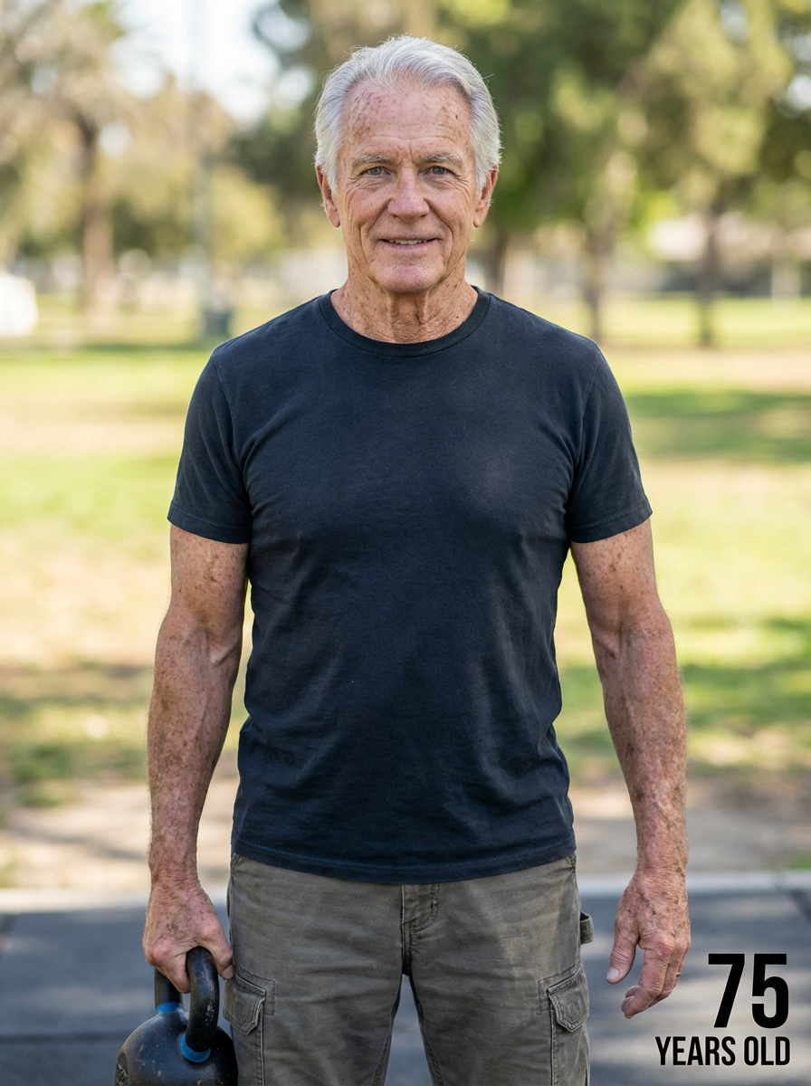 generate model at age 75 if model stays fit and muscle and healthy and clean diet healthy, add age label in bottom right 75 years old