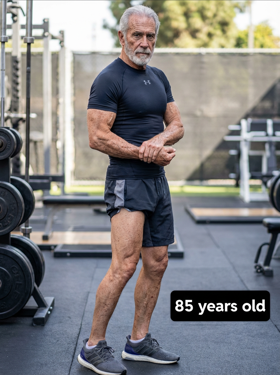generate model at age 85 if model stays fit and muscle and healthy and clean diet healthy, add age label in bottom right 85 years old
