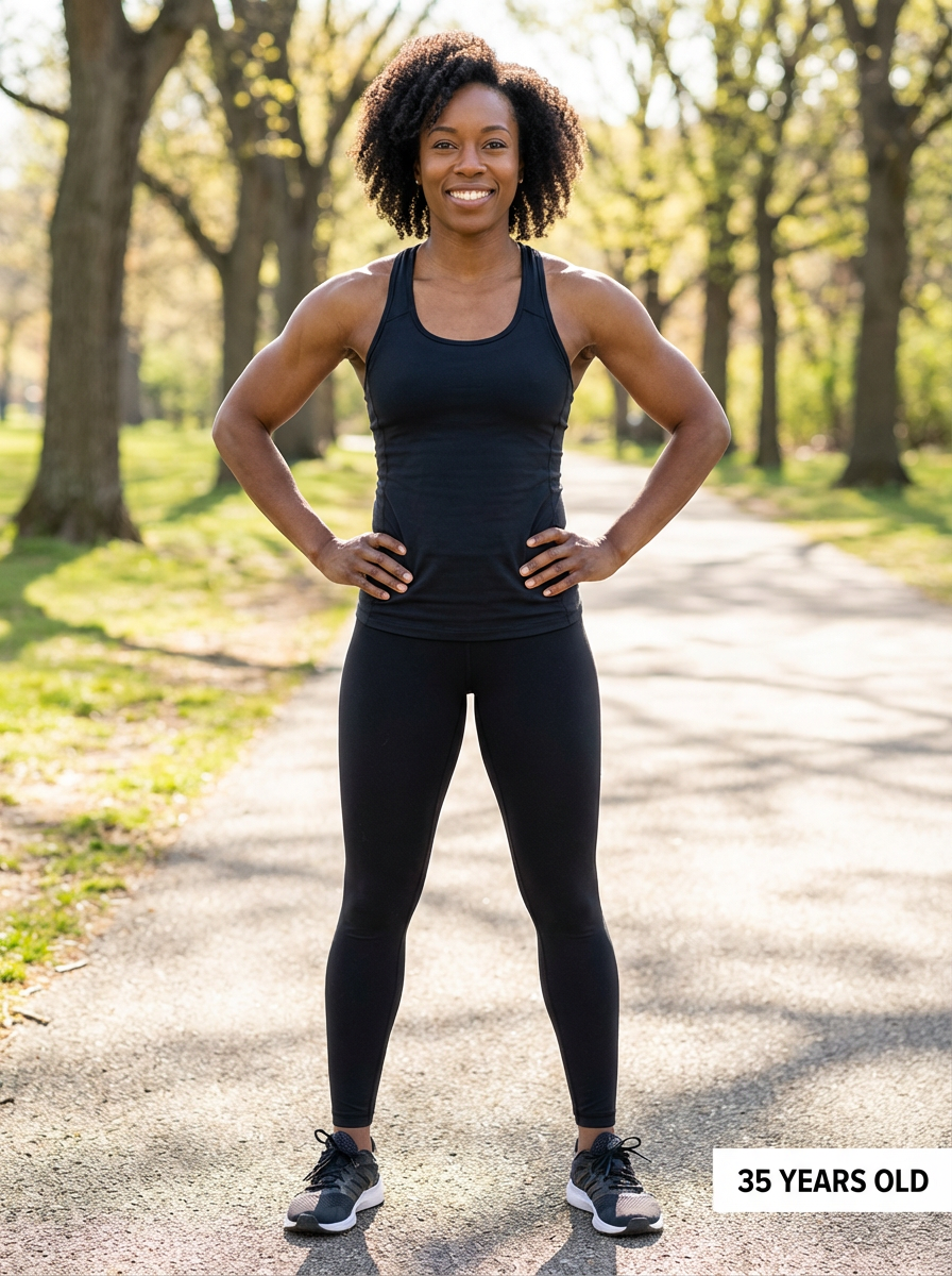 generate model at age 35 if model stays fit and muscle and healthy and clean diet healthy, add age label in bottom right 35 years old