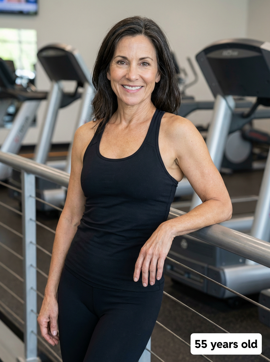 generate model at age 55 if model stays fit and muscle and healthy and clean diet healthy, add age label in bottom right 55 years old
