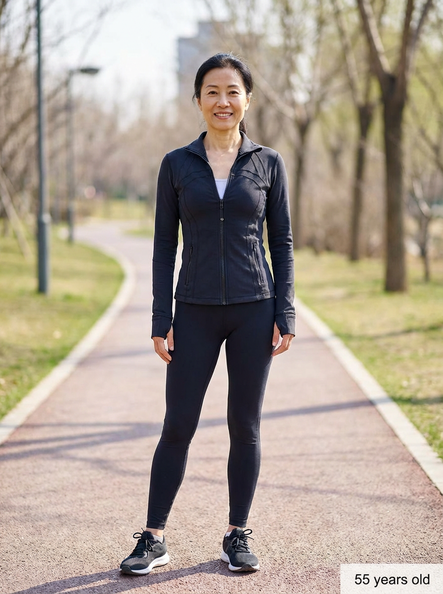 generate model at age 55 if model stays fit and muscle and healthy and clean diet healthy, add age label in bottom right 55 years old