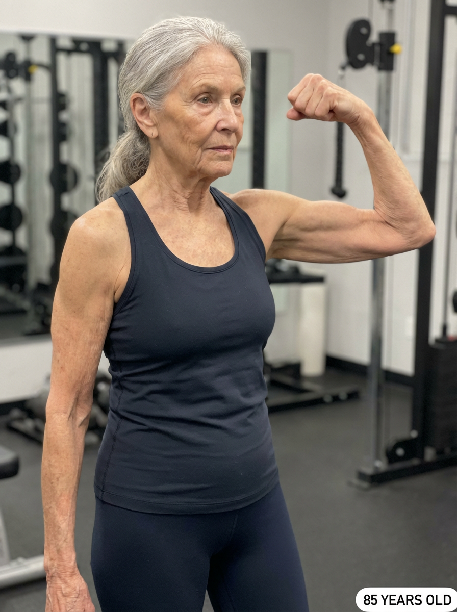 generate model at age 85 if model stays fit and muscle and healthy and clean diet healthy, add age label in bottom right 85 years old