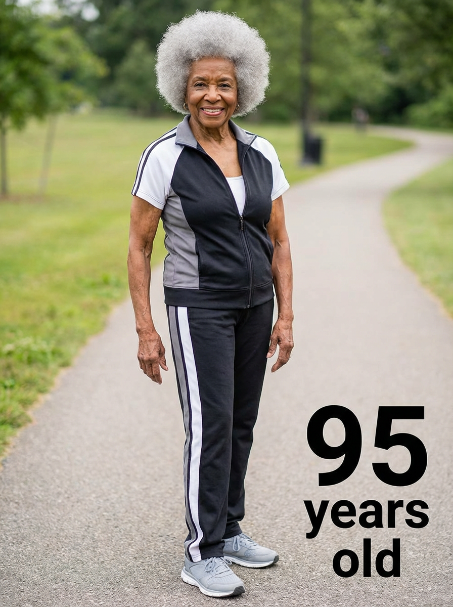 generate model at age 95 if model stays fit and muscle and healthy and clean diet healthy, add age label in bottom right 95 years old
