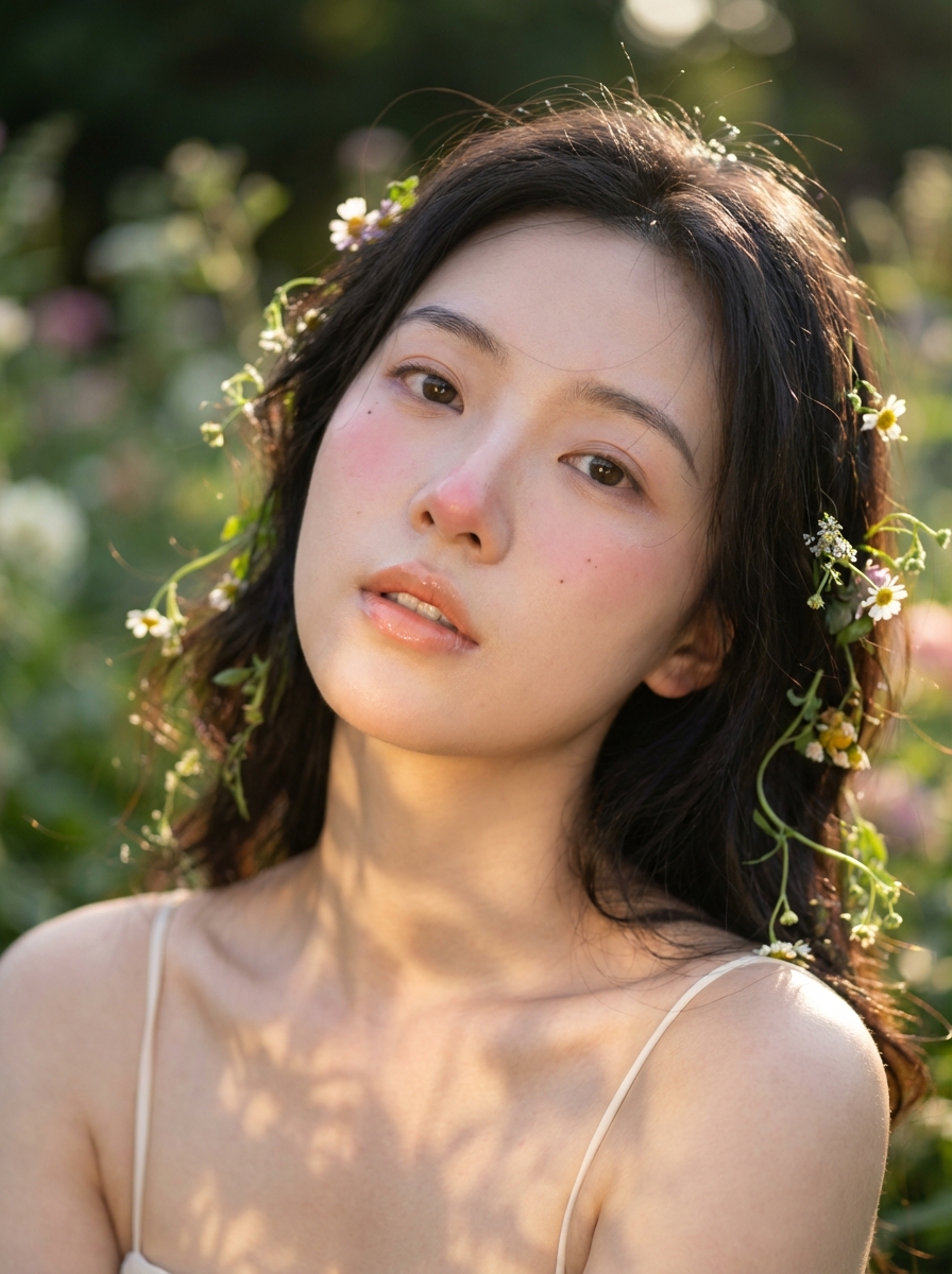 {"generation_protocol": {"meta_constraints": {"reference_adherence": "Strict Identity Preservation (Do not alter facial features)", "output_quality": "8K High-Definition, Hyper-realistic editorial portrait"}, "technical_configuration": {"camera_gear": "Nikon DSLR, 75mm Prime Lens, Eye-level angle", "exposure_settings": "Aperture f/1.2, Shutter 1/200s, ISO 100", "composition": "Tight close-up (Head and Shoulders), Pin-sharp focus on eyes, Vertical 9:16"}, "subject_definition": {"demographics": "young model", "pose": "Slightly tilted head, centered, gentle and vulnerable expression", "facial_details": {"eyes": "Large, expressive, direct eye contact", "mouth": "Lips slightly parted, glossy light peach-tone", "skin": "Fresh, dewy texture, soft pink sun-kissed blush on cheeks and nose"}, "styling": {"hair": "Loose, slightly tousled, interwoven with small flowers", "apparel": "Simple dress, thin straps"}}, "environment": {"setting": "Lush floral garden", "foreground": "Framed by vibrant small flowers (top and left edges)", "lighting": "Golden Hour, soft warm diffusion, distinct dappled shadows on neck/chest, subtle rim light"}, "mood_atmosphere": "Ethereal, Dreamy, Romantic, Soft diffusion effect"}}