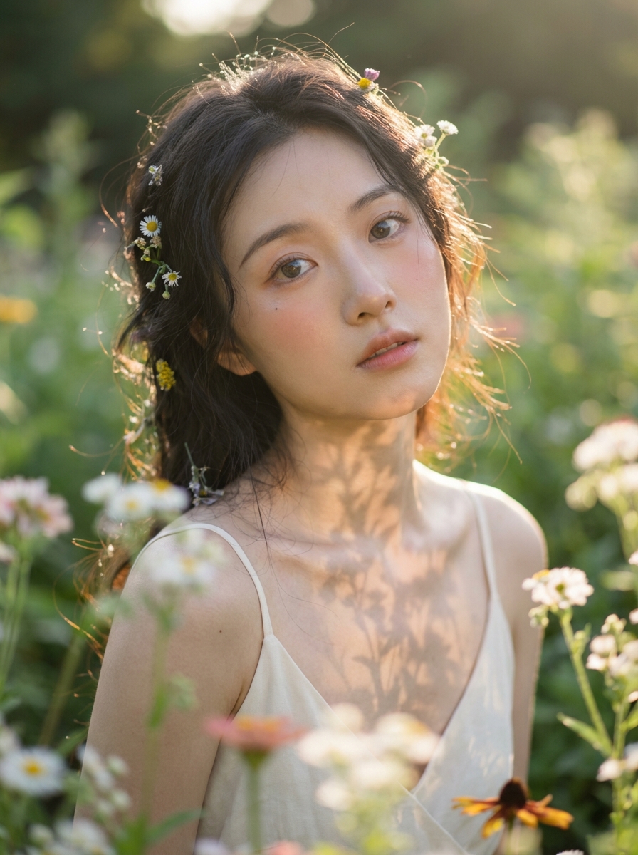 {"generation_protocol": {"meta_constraints": {"reference_adherence": "Strict Identity Preservation (Do not alter facial features)", "output_quality": "8K High-Definition, Hyper-realistic editorial portrait"}, "technical_configuration": {"camera_gear": "Nikon DSLR, 75mm Prime Lens, Eye-level angle", "exposure_settings": "Aperture f/1.2, Shutter 1/200s, ISO 100", "composition": "Tight close-up (Head and Shoulders), Pin-sharp focus on eyes, Vertical 9:16"}, "subject_definition": {"demographics": "young model", "pose": "Slightly tilted head, centered, gentle and vulnerable expression", "facial_details": {"eyes": "Large, expressive, direct eye contact", "mouth": "Lips slightly parted, glossy light peach-tone", "skin": "Fresh, dewy texture, soft pink sun-kissed blush on cheeks and nose"}, "styling": {"hair": "Loose, slightly tousled, interwoven with small flowers", "apparel": "Simple dress, thin straps"}}, "environment": {"setting": "Lush floral garden", "foreground": "Framed by vibrant small flowers (top and left edges)", "lighting": "Golden Hour, soft warm diffusion, distinct dappled shadows on neck/chest, subtle rim light"}, "mood_atmosphere": "Ethereal, Dreamy, Romantic, Soft diffusion effect"}}