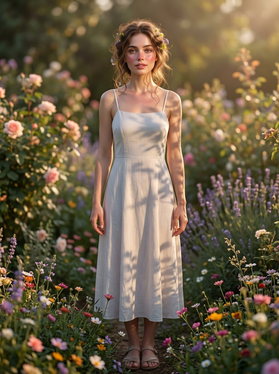 {"generation_protocol":{"meta_constraints":{"reference_adherence":"Strict Identity Preservation (Do not alter facial features)","output_quality":"8K High-Definition, Hyper-realistic editorial portrait"},"technical_configuration":{"camera_gear":"Nikon DSLR, 75mm Prime Lens, Eye-level angle","exposure_settings":"Aperture f\/1.2, Shutter 1\/200s, ISO 100","composition":"Tight close-up (Head and Shoulders), -sharp focus on eyes, Vertical 9:16"},"subject_definition":{"demographics":"young model","pose":"Slightly tilted head, centered, gentle and vulnerable expression","facial_details":{"eyes":"Large, expressive, direct eye contact","mouth":"Lips slightly parted, glossy light peach-tone","skin":"Fresh, dewy texture, soft pink sun-kissed blush on cheeks and nose"},"styling":{"hair":"Loose, slightly tousled, interwoven with small flowers","apparel":"Simple dress, thin straps"}},"environment":{"setting":"Lush floral garden","foreground":"Framed by vibrant small flowers (top and left edges)","lighting":"Golden Hour, soft warm diffusion, distinct dappled shadows on neck\/chest, subtle rim light"},"mood_atmosphere":"Ethereal, Dreamy, Romantic, Soft diffusion effect"}}