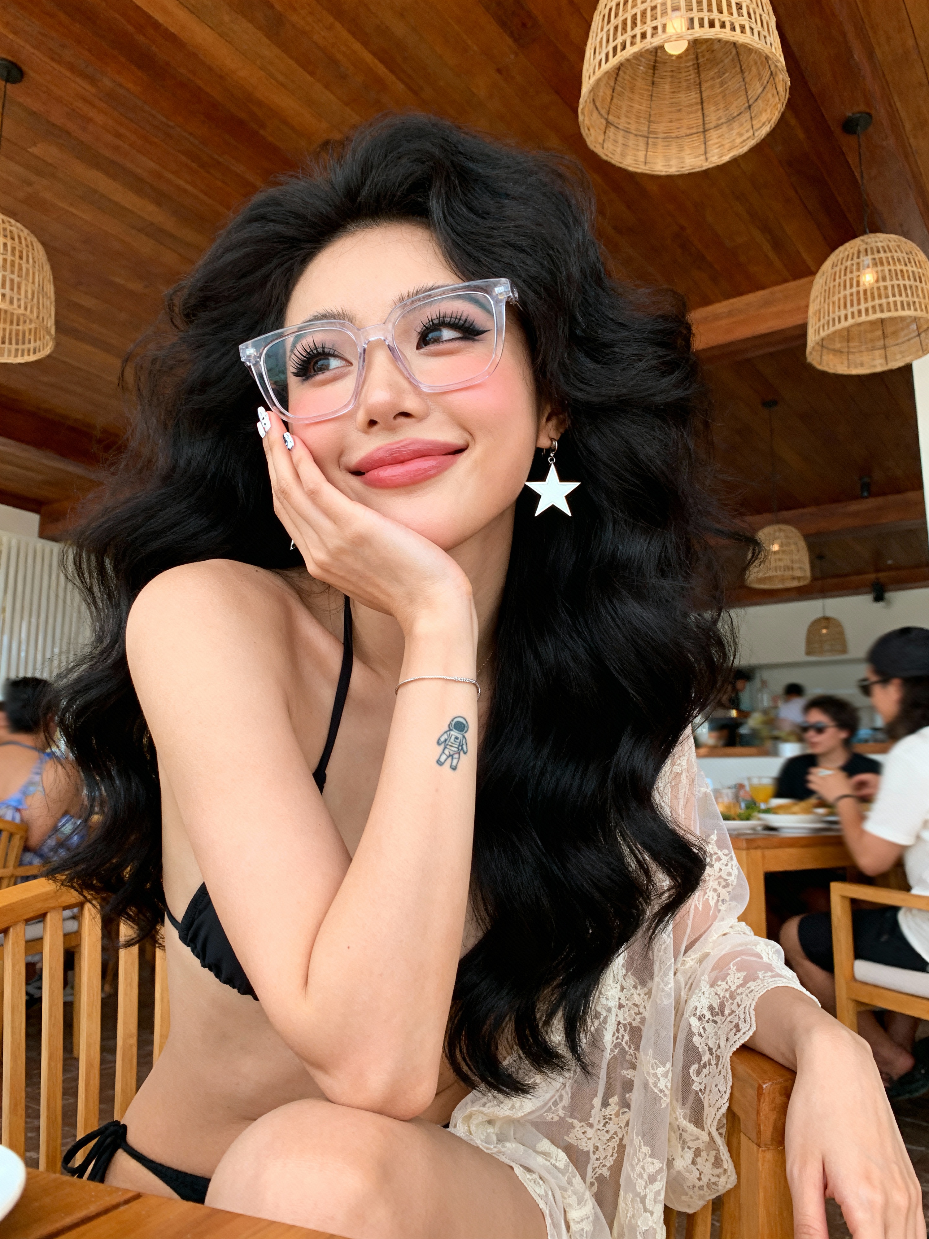 {"generation_request": {"meta_data": {"task_type": "text_to_image_with_face_swap", "priority": "high", "version": "v1.3"}, "technical_constraints": {"face_preservation": {"enabled": true, "reference_mode": "strict", "parameters": {"use_reference_face_only": true, "preserve_original_features": true, "preservation_strength": 1, "match_criteria": ["facial_features", "skin_texture", "expression", "proportions"]}}, "output_settings": {"aspect_ratio": "3:4", "orientation": "portrait", "resolution_target": "ultra_high_res", "render_engine_style": "photorealistic"}}, "creative_prompt": {"subject_profile": {"demographics": {"gender": "model", "age_group": "young_adult"}, "appearance": {"hair": {"style": "jet-black, very voluminous glamorous waves", "texture": "soft, thick, high-volume", "placement": "loose with face-framing strands"}, "makeup": {"eyes": "smoky eye makeup with smudged liner, long lashes ", "skin": "natural skin texture, no beauty filter", "lips": "subtle lip filler look (slightly plumper lips), nude-rose satin finish"}, "eyewear": {"type": "thick-frame glasses", "fit": "fashionable, proportional, not oversized to distortion", "lens": "clear lenses with minimal reflection (eyes still visible)"}, "expression": {"type": "soft playful smile", "gaze": "looking slightly sideways", "micro_expression": "reactionary (as if hearing name)"}}, "styling": {"outfit": {"base": "bikini (tasteful, non-explicit coverage)", "top_layer": "sheer lace elegant blouse over the bikini (transparent lace, chic, not vulgar)"}, "nails": "glossy polish", "jewelry": ["star-shaped earrings (clearly visible)", "thin bracelet (right wrist)"], "tattoo": {"design": "small astronaut tattoo", "placement": "visible on forearm or upper arm (natural placement)"}}, "pose_action": {"body": "sitting sideways", "posture": "relaxed, shoulders turned to camera", "limbs": {"arm_left": "resting on chair backrest", "arm_right": "gently touching cheek"}}}, "scene_context": {"location": "beachside restaurant/café", "furniture": "wooden chair", "atmosphere": {"vibe": "summery, relaxed, social", "background": ["people dining (blurred)", "wooden ceiling with woven lampshades", "warm wooden textures"]}, "lighting_setup": {"primary": "natural daylight", "secondary": "warm indoor ambient accents", "specifics": "sunlit with soft glow on high points (cheeks, collarbones)"}}, "photography_style": {"camera_angle": "slightly high angle (above eye level)", "framing": "mid-shot", "lens_character": "handheld lifestyle aesthetic, professional camera look", "color_grading": {"palette": ["warm tan", "black", "light brown"], "skin_tone_rendering": "soft, natural"}}, "negative_prompt": ["face morphing", "wrong identity", "beauty filter", "plastic skin", "over-smoothed skin", "blurry face", "bad anatomy", "extra limbs", "extra fingers", "warped hands", "explicit nudity", "nipples visible", "areola visible", "see-through exposing nipples", "pornographic framing", "glasses covering eyes completely", "heavy glare on glasses", "text", "watermark", "logo", "cartoon", "anime", "cgi render"]}}}