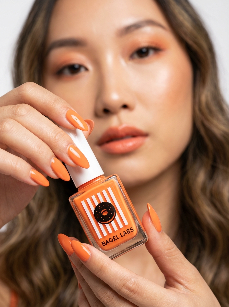 {"generation_request": {"meta_data": {"tool": "NanoBanana Pro", "task_type": "photorealistic_product_beauty_macro", "version": "v1.0", "priority": "high"}, "references": {"female_reference_image": "UPLOAD_FEMALE_REFERENCE (REQUIRED)", "pose_style_reference_image": "UPLOAD_THIS_IMAGE_AS_STYLE_REFERENCE (OPTIONAL)", "reference_rules": {"preserve_uploaded_character_identities": true, "identity_lock_strength": 0.99, "strict_face_match": true, "same_pose_same_framing": true, "do_not_copy_any_unprovided_identity": true}}, "output_settings": {"aspect_ratio": "3:4", "orientation": "portrait", "resolution": "ultra_high_res", "render_style": "photorealistic_editorial_beauty_macro", "sharpness": "high", "film_grain": "none_or_very_subtle"}, "creative_prompt": {"scene_summary": "Ultra photoreal editorial beauty macro shot. a model holds a nail polish bottle extremely close to the camera with dramatic perspective. The bottle is the main focus (tack sharp), while the face is softly out of focus behind it. seamless background. Keep the same composition and hand-to-camera product framing as the reference image.", "environment": {"setting": "studio", "background": "pure seamless backdrop", "lighting": "clean high-key studio lighting, soft shadows, crisp specular highlights on glass and nails"}, "camera": {"type": "beauty macro / close-up product shot", "lens_look": "wide-close macro perspective (24-35mm equivalent feel), dramatic foreshortening", "focus": "product label and bottle edges tack sharp; face slightly soft bokeh", "aperture": "f2.0_to_f2.8", "do_not_crop": "keep full bottle visible and readable"}, "subject": {"type": "young_adult_woman", "identity": "MUST match uploaded model reference exactly", "hair": {"style": "open_long_wavy", "volume": "high_volume_bouncy_waves", "finish": "glossy_healthy"}, "makeup": {"theme": "orange_peachy_editorial", "skin": "real_skin_texture_visible_pores_no_blur", "eyes": "soft_warm_brown_liner + subtle_shimmer_orange_peach_lid", "cheeks": "peach_blush", "lips": "warm_nude_peach_or_soft_orange_gloss", "overall": "very_beautiful_alluring_high_fashion (WITHOUT changing facial structure)"} , "expression": "confident_sultry_soft_gaze"}, "hands_and_nails": {"pose": "same as reference: both hands framing and holding the bottle close to lens", "nails": {"shape": "almond", "color": "vivid_orange_match_product", "finish": "glossy"}, "anatomy_rules": "perfect hands, five fingers each, no warping, no fused fingers"}, "product_design": {"object": "nail_polish_bottle", "bottle_material": "clear_glass_with_realistic_refraction", "polish_color": "vivid_orange", "label_design": {"base": "clean_modern", "pattern": "white_stripes_on_orange_theme (orange + striped design cues)", "logo": "Bagel symbol placed prominently on the front label", "brand_text": "BAGEL LABS (exact text) printed clearly on the bottle label", "print_rules": "text must be crisp, aligned, not warped, no gibberish letters"}, "cap_design": {hair, "pattern": "tiny repeating bagel icons/pattern all around the cap (mini bagel motifs), subtle and cute, not messy", "no_extra_branding": "only the mini bagel pattern, no additional random text"}}, "quality_rules": ["ultra realistic skin texture (no plastic smoothing)", "natural eye catchlights", "no extra people", "no extra objects", "no watermark, no UI", "product label must be readable and correct: Bagel symbol + 'Bagel Labs'", "true-to-life glass highlights and reflections", "high-end magazine beauty advertising look"]}, "negative_prompt": ["text outside the product label", "watermark", "logo errors", "misspelled words", "gibberish typography", "extra people", "extra hands", "extra fingers", "warped hands", "deformed nails", "blurred product label", "low resolution", "plastic skin", "over smoothing", "face drift", "identity change", "cartoon", "cgi"]}}