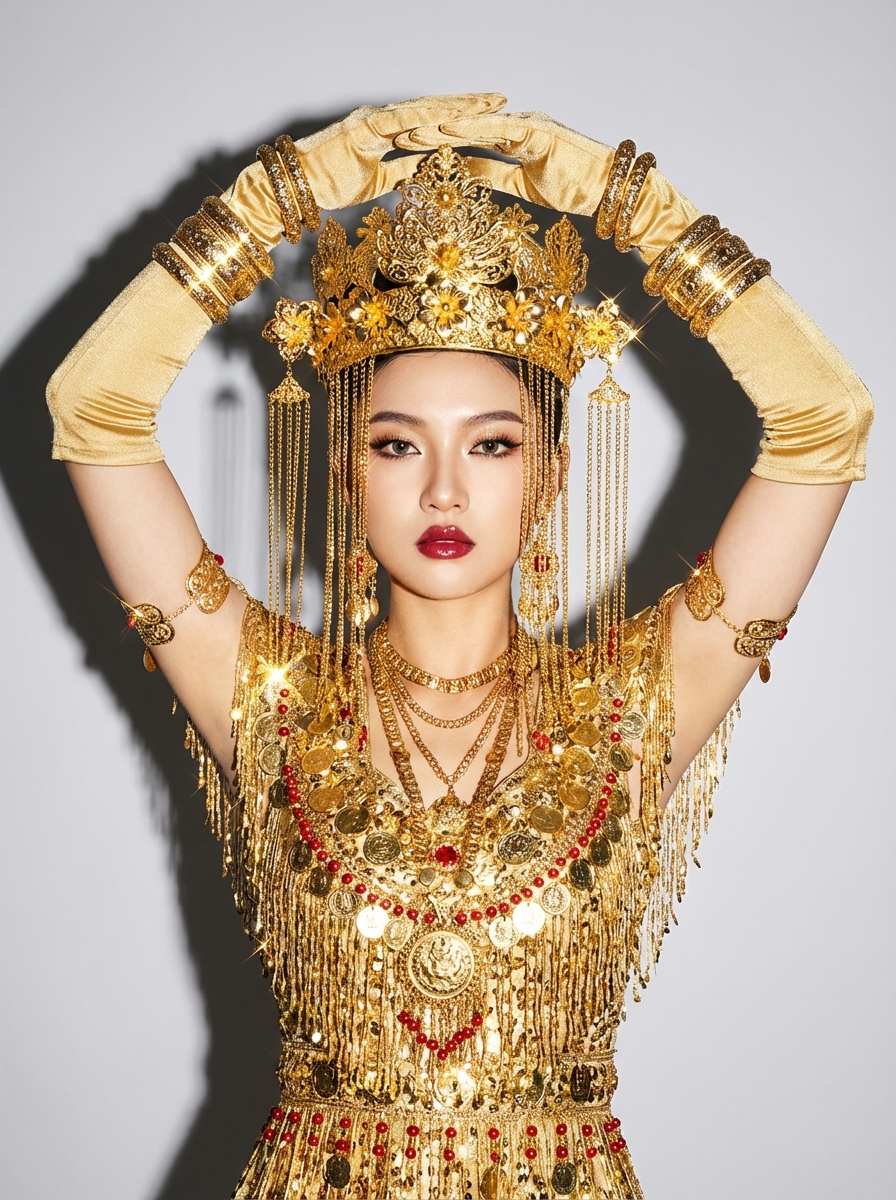 {"generation_request": {"meta_data": {"tool": "NanoBanana Pro", "task_type": "text_to_image_photoreal_fashion_editorial", "version": "v1.0", "priority": "high"}, "references": {"character_reference_image": "UPLOAD_YOUR_CHARACTER_REFERENCE (OPTIONAL_IF_YOU_WANT_SAME_PERSON)", "reference_rules": {"if_character_reference_provided_then_preserve_identity": true, "identity_lock_strength": 0.98, "do_not_copy_any_unprovided_identity": true}}, "output_settings": {"aspect_ratio": "4:5", "orientation": "portrait", "resolution": "ultra_high_res", "render_style": "photorealistic_high_flash_editorial", "sharpness": "high", "film_grain": "subtle"}, "creative_prompt": {"scene_summary": "High-fashion studio editorial portrait inspired by ornate Southeast ceremonial regalia. Single model in a maximalist gold costume with heavy jewelry, dramatic makeup, and an elaborate crown-like headdress with dangling chains. Clean studio background with harsh direct flash for crisp shadows and sparkling specular highlights. No text/logos/watermarks.", "subject": {"type": "adult_woman", "pose": "front-facing, arms raised overhead with wrists crossed, hands resting above the crown; elegant symmetrical pose", "expression": "calm, regal, slightly intense gaze", "hair": "short blunt bob with straight bangs (or sleek hair hidden under headpiece)", "makeup": {"style": "theatrical editorial", "eyes": "bold eyeliner, heavy lashes, soft colored accents around eyes, high-contrast highlight", "lips": "glossy deep red", "skin": "porcelain-smooth but realistic texture, luminous highlights"}}, "wardrobe": {"headpiece": "massive ornate gold crown/headdress with intricate filigree, floral motifs, and long dangling gold chains framing the face and cascading down both sides", "jewelry": ["large decorative nose ring with a delicate chain detail", "layered gold necklaces with red bead accents", "heavy gold earrings ", "multiple gold bangles and beaded bracelets", "gold shoulder/arm ornaments with fringe tassels"], "costume": "full gold embellished dress/armor-like bodice covered in coins, medallions, filigree plates, beadwork, and shimmering fringe; red bead accents throughout; ornate waist belt; dense sparkling texture"}, "environment": {"background": "pure seamless studio backdrop", "floor": "not visible or minimal", "props": "none"}, "lighting_and_camera": {"lighting": "harsh direct on-camera flash, strong crisp shadow behind subject, high contrast, specular sparkle on gold, slight overflash highlights but controlled", "camera": "high-end editorial shot with point-and-shoot flash vibe", "lens": "50mm (full-frame look)", "aperture": "f/5.6", "iso": "200", "shutter": "1/160", "focus": "sharp eyes and facial jewelry; crisp detail on gold textures; background clean"}, "composition": {"framing": "mid-to-full body portrait (waist to head), centered subject, headpiece and dangling chains fully in frame", "style_notes": "maximalist luxury, museum-like regalia, couture editorial, highly detailed gold surfaces"}, "strict_rules": ["NO text", "NO logos", "NO watermark", "single subject only", "background only", "keep the costume extremely ornate and gold-heavy with dangling chains", "avoid cultural caricature; keep it respectful couture/editorial styling"]}, "negative_prompt": ["text", "logo", "watermark", "extra people", "blurry face", "low resolution", "cheap plastic jewelry", "missing hands", "bad hands, fused fingers, extra fingers", "messy background, studio gear visible", "muted dull gold (must be shiny)", "over-smoothed plastic skin"]}}