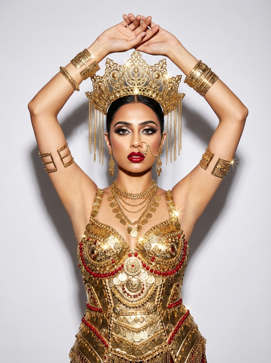 {"generation_request": {"meta_data": {"tool": "NanoBanana Pro", "task_type": "text_to_image_photoreal_fashion_editorial", "version": "v1.0", "priority": "high"}, "references": {"character_reference_image": "UPLOAD_YOUR_CHARACTER_REFERENCE (OPTIONAL_IF_YOU_WANT_SAME_PERSON)", "reference_rules": {"if_character_reference_provided_then_preserve_identity": true, "identity_lock_strength": 0.98, "do_not_copy_any_unprovided_identity": true}}, "output_settings": {"aspect_ratio": "4:5", "orientation": "portrait", "resolution": "ultra_high_res", "render_style": "photorealistic_high_flash_editorial", "sharpness": "high", "film_grain": "subtle"}, "creative_prompt": {"scene_summary": "High-fashion studio editorial portrait inspired by ornate Southeast ceremonial regalia. Single model in a maximalist gold costume with heavy jewelry, dramatic makeup, and an elaborate crown-like headdress with dangling chains. Clean studio background with harsh direct flash for crisp shadows and sparkling specular highlights. No text/logos/watermarks.", "subject": {"type": "adult_woman", "pose": "front-facing, arms raised overhead with wrists crossed, hands resting above the crown; elegant symmetrical pose", "expression": "calm, regal, slightly intense gaze", "hair": "short blunt bob with straight bangs (or sleek hair hidden under headpiece)", "makeup": {"style": "theatrical editorial", "eyes": "bold eyeliner, heavy lashes, soft colored accents around eyes, high-contrast highlight", "lips": "glossy deep red", "skin": "porcelain-smooth but realistic texture, luminous highlights"}}, "wardrobe": {"headpiece": "massive ornate gold crown/headdress with intricate filigree, floral motifs, and long dangling gold chains framing the face and cascading down both sides", "jewelry": ["large decorative nose ring with a delicate chain detail", "layered gold necklaces with red bead accents", "heavy gold earrings ", "multiple gold bangles and beaded bracelets", "gold shoulder/arm ornaments with fringe tassels"], "costume": "full gold embellished dress/armor-like bodice covered in coins, medallions, filigree plates, beadwork, and shimmering fringe; red bead accents throughout; ornate waist belt; dense sparkling texture"}, "environment": {"background": "pure seamless studio backdrop", "floor": "not visible or minimal", "props": "none"}, "lighting_and_camera": {"lighting": "harsh direct on-camera flash, strong crisp shadow behind subject, high contrast, specular sparkle on gold, slight overflash highlights but controlled", "camera": "high-end editorial shot with point-and-shoot flash vibe", "lens": "50mm (full-frame look)", "aperture": "f/5.6", "iso": "200", "shutter": "1/160", "focus": "sharp eyes and facial jewelry; crisp detail on gold textures; background clean"}, "composition": {"framing": "mid-to-full body portrait (waist to head), centered subject, headpiece and dangling chains fully in frame", "style_notes": "maximalist luxury, museum-like regalia, couture editorial, highly detailed gold surfaces"}, "strict_rules": ["NO text", "NO logos", "NO watermark", "single subject only", "background only", "keep the costume extremely ornate and gold-heavy with dangling chains", "avoid cultural caricature; keep it respectful couture/editorial styling"]}, "negative_prompt": ["text", "logo", "watermark", "extra people", "blurry face", "low resolution", "cheap plastic jewelry", "missing hands", "bad hands, fused fingers, extra fingers", "messy background, studio gear visible", "muted dull gold (must be shiny)", "over-smoothed plastic skin"]}}