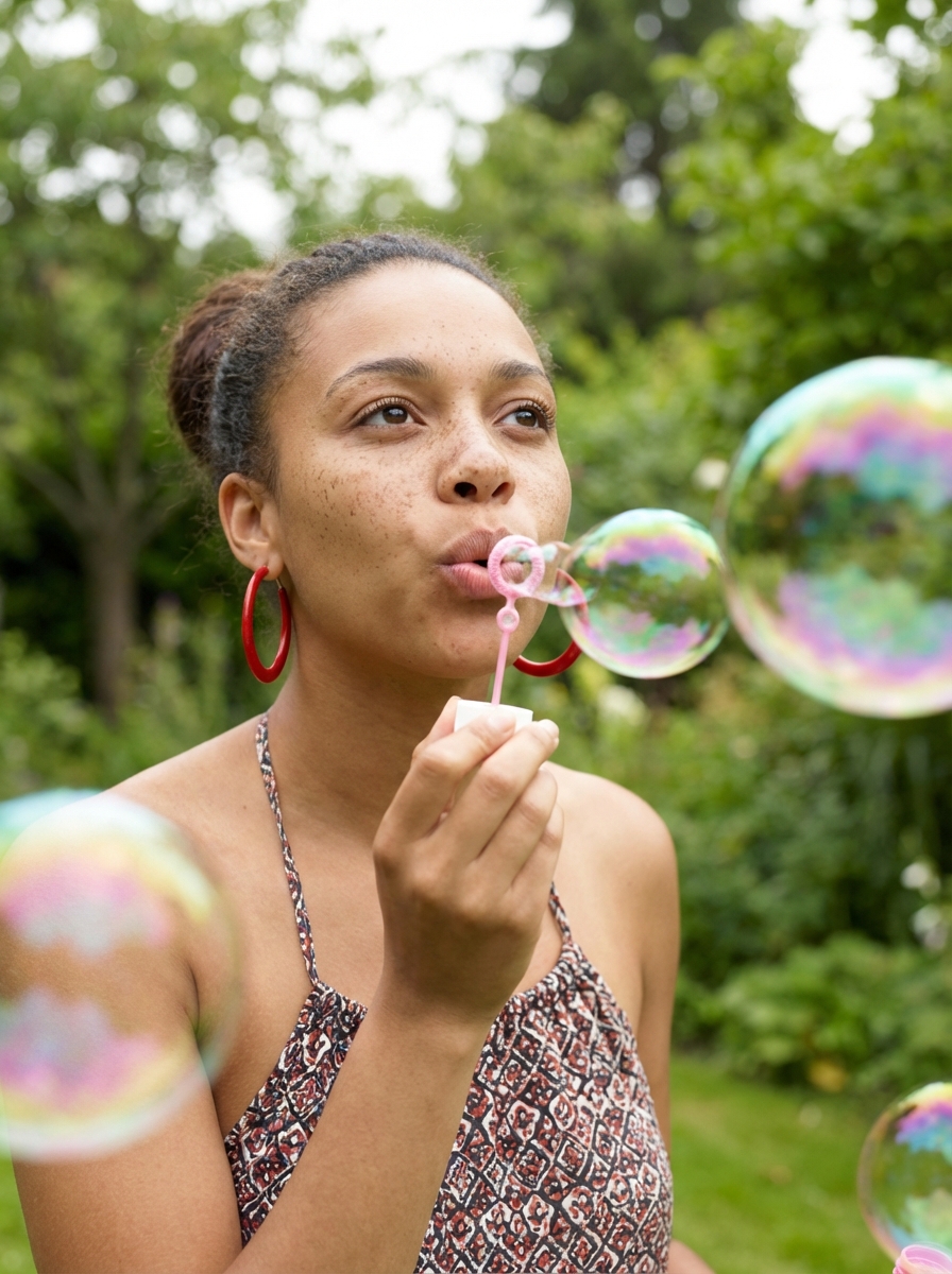 {"generation_request": {"meta_data": {"tool": "NanoBanana Pro", "task_type": "text_to_image_photoreal_outdoor_bubble_portrait", "version": "v1.0", "priority": "high"}, "output_settings": {"aspect_ratio": "4:5", "orientation": "portrait", "resolution": "ultra_high_res", "render_style": "photorealistic_lifestyle_snapshot", "sharpness": "high", "film_grain": "subtle_natural"}, "creative_prompt": {"scene_summary": "Photorealistic candid outdoor lifestyle photo. A young model is blowing soap bubbles with a small pink bubble wand. She looks upward with a playful expression while leaning slightly toward the camera. The bubbles are large and iridescent (rainbow reflections), floating across the foreground and right side of frame. Background is a lush green garden with trees, leaves, and soft depth-of-field blur. Natural daylight, soft and clean, realistic skin texture and pores, mild freckles, no beauty filter.", "subject": {"gender": "model", "age": "young adult", "skin": "natural texture, mild freckles, realistic pores", "hair": "hair, bangs/fringe, slightly tousled", "expression": "playful, cheeks slightly puffed while blowing bubbles, eyes looking up", "accessories": "bold red if(gender=f){hoop earrings } ", "outfit": "halter-neck sleeveless top", "hands_props": "pink bubble wand held near lips, small bubble solution bottle in the other hand"}, "environment": {"location": "green backyard garden / orchard-like trees", "background": "dense foliage, branches and leaves framing the top, soft bokeh", "lighting": "natural daylight, soft highlights, no harsh shadows"}, "camera": {"type": "smartphone / casual DSLR look", "angle": "slightly low to eye-level with a mild wide-angle feel", "lens_look": "24–28mm equivalent", "focus": "face tack sharp, bubbles sharp enough to read, background softly blurred"}, "quality_rules": ["photorealistic skin (no plastic smoothing)", "natural colors, realistic bubble refraction", "no extra people", "no text, no logos, no watermark", "hands and fingers anatomically correct"]}, "negative_prompt": ["cartoon", "anime", "cgi look", "beauty filter", "over-smoothed plastic skin", "text", "logo", "watermark", "extra people", "deformed hands", "extra fingers", "blur", "low resolution", "overexposed face", "weird eyes"]}}