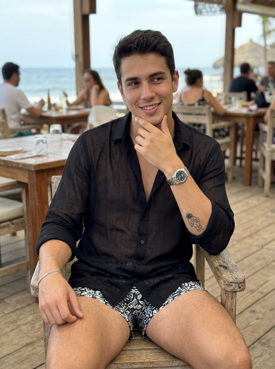 {"generation_request":{"meta_data":{"task_type":"text_to_image_with_face_swap","priority":"high","version":"v1.3"},"technical_constraints":{"face_preservation":{"enabled":true,"reference_mode":"strict","parameters":{"use_reference_face_only":true,"preserve_original_features":true,"preservation_strength":1,"match_criteria":["facial_features","skin_texture","expression","proportions"]}},"output_settings":{"aspect_ratio":"3:4","orientation":"portrait","resolution_target":"ultra_high_res","render_engine_style":"photorealistic"}},"creative_prompt":{"subject_profile":{"demographics":{"gender":"male","age_group":"young_adult"},"appearance":{"hair":{"style":"jet-black, very voluminous textured quiff","texture":"soft, thick, high-volume","placement":"side-swept with textured fringe"},"makeup":{"eyes":"natural features, clean groomed","skin":"natural skin texture with light stubble, no beauty filter","lips":"natural lips, subtle matte finish"},"eyewear":{"type":"thick-frame glasses","fit":"fashionable, proportional, not oversized to distortion","lens":"clear lenses with minimal reflection (eyes still )"},"expression":{"type":"confident playful smile","gaze":"looking slightly sideways","micro_expression":"reactionary (as if hearing name)"}},"styling":{"outfit":{"base":"swim shorts (tasteful, non-explicit coverage)","top_layer":"sheer lightweight elegant button-up shirt over the swim shorts (transparent fabric, chic, not vulgar)"},"nails":"short groomed nails","jewelry":["watch (clearly )","thin chain bracelet (right wrist)"],"tattoo":{"design":"small astronaut tattoo","placement":" on forearm or upper arm (natural placement)"}},"pose_action":{"body":"sitting sideways","posture":"relaxed, shoulders turned to camera","limbs":{"arm_left":"resting on chair backrest","arm_right":"casually touching jawline"}}},"scene_context":{"location":"beachside restaurant\/caf\u00e9","furniture":"wooden chair","atmosphere":{"vibe":"summery, relaxed, social","background":["people dining (blurred)","wooden ceiling with woven lampshades","warm wooden textures"]},"lighting_setup":{"primary":"natural daylight","secondary":"warm indoor ambient accents","specifics":"sunlit with soft glow on high points (cheeks, collarbones)"}},"photography_style":{"camera_angle":"slightly high angle (above eye level)","framing":"mid-shot","lens_character":"handheld lifestyle aesthetic, professional camera look","color_grading":{"palette":["warm tan","black","light brown"],"skin_tone_rendering":"soft, natural"}},"negative_prompt":["face morphing","wrong identity","beauty filter","plastic skin","over-smoothed skin","blurry face","bad anatomy","extra limbs","extra fingers","warped hands","explicit "," ","areola ","see-through ","pornographic framing","glasses covering eyes completely","heavy glare on glasses","text","watermark","logo","cartoon","anime","cgi render"]}}}