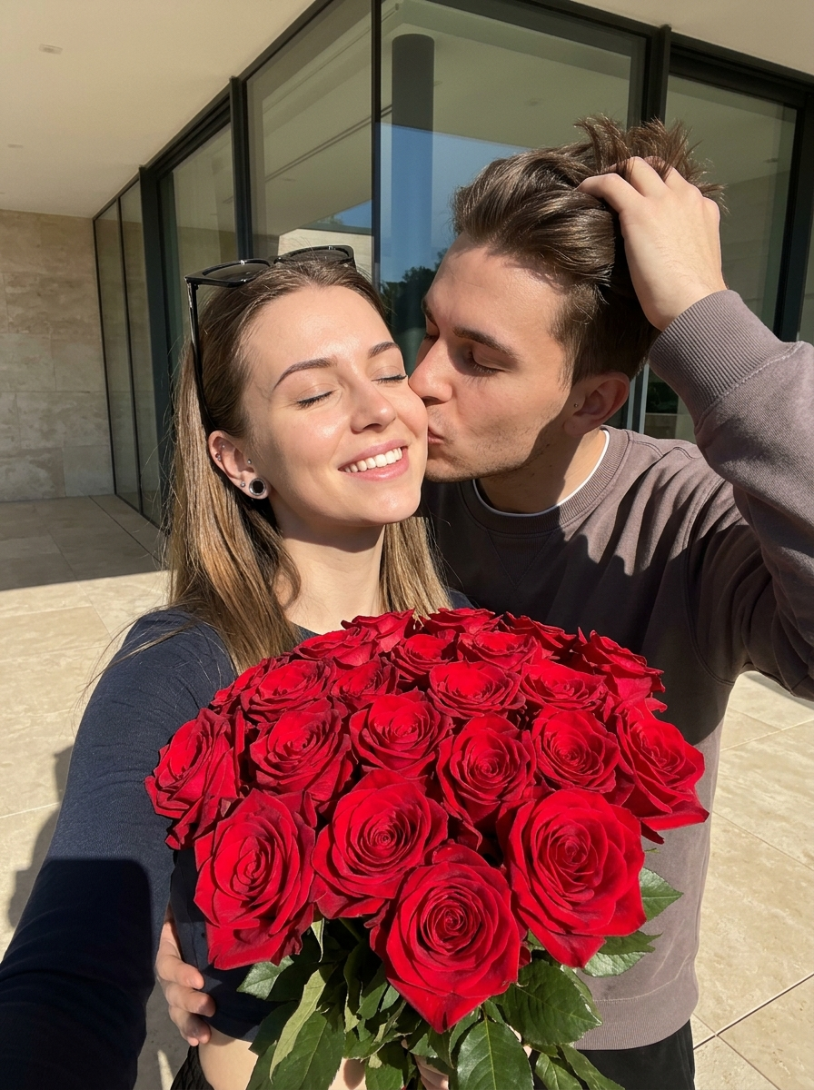 {"generation_request":{"meta_data":{"tool":"NanoBanana Pro","task_type":"photorealistic_single_image","version":"v1.0","priority":"high"},"references":{"male_character_reference_image":"UPLOAD_MALE_REFERENCE (REQUIRED)","female_character_reference_image":"UPLOAD_FEMALE_REFERENCE (REQUIRED)","pose_lighting_reference_image":"UPLOAD_THIS_IMAGE_AS_REFERENCE (RECOMMENDED)","reference_rules":{"preserve_uploaded_character_identities":true,"identity_lock_strength":0.99,"strict_face_match":true,"same_people_only":true,"no_identity_drift":true}},"output_settings":{"aspect_ratio":"4:5","orientation":"portrait","resolution":"ultra_high_res","render_style":"photorealistic_editorial_candid","sharpness":"high","film_grain":"subtle"},"creative_prompt":{"scene_summary":"Photorealistic candid couple moment outdoors at a modern villa terrace\/patio. Strong midday sunlight with crisp, hard-edged shadows across the faces. The model the model's cheek. the model smiles with eyes closed, joyful expression. A large bouquet of vivid red roses fills the lower half of the frame. Clean, natural colors, realistic skin texture and pores. No text\/logos\/watermarks.","environment":{"location":"outdoors","setting":"modern villa terrace with large glass facade reflecting trees\/sky; beige stone floor; minimal outdoor furniture (softly out of focus)","lighting":"harsh natural midday sun, high contrast, sharp shadows; sunlight coming from upper left creating a distinct shadow line across faces"},"camera":{"type":"smartphone photo or compact camera candid","angle":"close-up couple portrait, slightly off-center; tight crop","lens_look":"35-50mm equivalent look, natural perspective (not ultra-wide)","focus":"faces and bouquet sharp; background softly blurred"},"subjects":{"male_action":" the model's cheek (affectionate, gentle)","male_pose_details":"one hand lifting\/raking through his hair; wristband ; casual posture","female_action":"eyes closed, big smile, cheeks lifted; face turned slightly toward the ","female_pose_details":"holding bouquet close to chest, bouquet dominates foreground"},"wardrobe_and_style":{"consistency_rule":" drift; keep accessories consistent","male":{"top":"sweatshirt\/hoodie (no logos)"},"female":{"top":"dark long-sleeve top (no logos)","hair":"straight hair, sleek and shiny; sunglasses resting on top of head","jewelry":"small ear piercings\/studs (subtle)"}},"props":{"bouquet":"very large bouquet of red roses with green leaves and small filler flowers; roses vivid and crisp; bouquet occupies bottom half of the image"},"quality_rules":["ultra realistic skin texture (no plastic smoothing)","natural eye\/skin highlights","accurate teeth and mouth anatomy (no warping)","no extra people","no additional random accessories","maintain strong sunlight + shadow line similar to reference"]},"negative_prompt":["text, logo, watermark","extra people","identity drift, face change","beauty filter, plastic skin","overly wide lens distortion","blur, low resolution","bad anatomy, deformed teeth, warped mouths","blood, bruises, injury, violence","random jewelry or accessories not specified"]}}