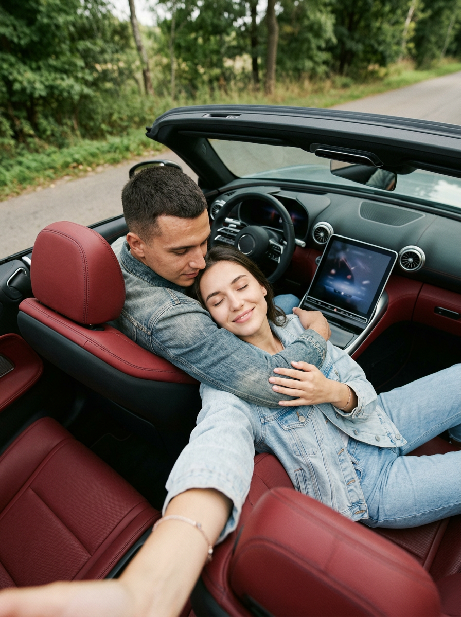 {"generation_request":{"meta_data":{"tool":"NanoBanana Pro","task_type":"photoreal_cinematic_couple_car_selfie","version":"v1.0_TOPDOWN_CONVERTIBLE_RED_LEATHER_ROMANCE","priority":"highest"},"output_settings":{"aspect_ratio":"4:5","orientation":"portrait","resolution":"ultra_high_res","render_style":"ultra_photoreal_cinematic","sharpness":"crisp_but_natural","film_grain":"subtle_analog","color_grade":"clean_true_to_life_warm","retouch_level":"editorial_minimal_keep_texture","noise_reduction":"low"},"hard_constraints":["Exactly TWO human subjects (one male, one female).","Photorealistic only (no illustration, no CGI).","Top-down car selfie perspective from above the front seats.","Luxury convertible interior with deep red leather seats.","No readable text on screens or signs; no logos; no watermark.","Natural anatomy, correct hands\/fingers, realistic fabric folds."],"creative_prompt":{"scene_summary":"Create an ultra-photoreal cinematic top-down car selfie in a luxury convertible parked on a quiet road. The camera angle is high and slightly diagonal above the front seats, looking down into the cabin.\n\nSubjects:\n- One young model and one young model cuddling in the front seats.\n- The model sits behind\/alongside the model, wrapping his arms around her in a protective hug.\n- The model reclines comfortably against him, eyes closed with a peaceful smile.\n\nWardrobe:\n- Both wear casual denim outfits (denim jacket and jeans vibe), modern and relaxed.\n\nCar interior:\n- Deep red premium leather seats and door panels, luxury stitching.\n- Modern dashboard with a large center infotainment screen (screen content must be blurred\/abstract, NO readable UI text).\n- Steering wheel ; avoid any brand logo or make it unrecognizable.\n\nForeground detail:\n- The model's arm extends toward the camera (selfie feel), with a bracelet and subtle accessories.\n\nEnvironment:\n- Parked on a rural road with greenery and trees beyond the windshield area.\n- Soft daylight, natural outdoor ambience.\n\nLighting & look:\n- Natural daylight with gentle contrast; clean highlights on red leather.\n- Editorial realism: natural skin texture, no over-smoothing.\n- Shallow-to-medium depth of field keeping the couple sharp, background slightly softer.\n\nMood:\n- Romantic, cozy, , modern luxury lifestyle."},"negative_prompt":["extra people","more than two subjects","readable text","logos","watermark","brand marks","cartoon","anime","cgi","plastic skin","over-retouched faces","warped hands","extra fingers","distorted anatomy","blurry faces","low resolution","overexposed highlights"]}}