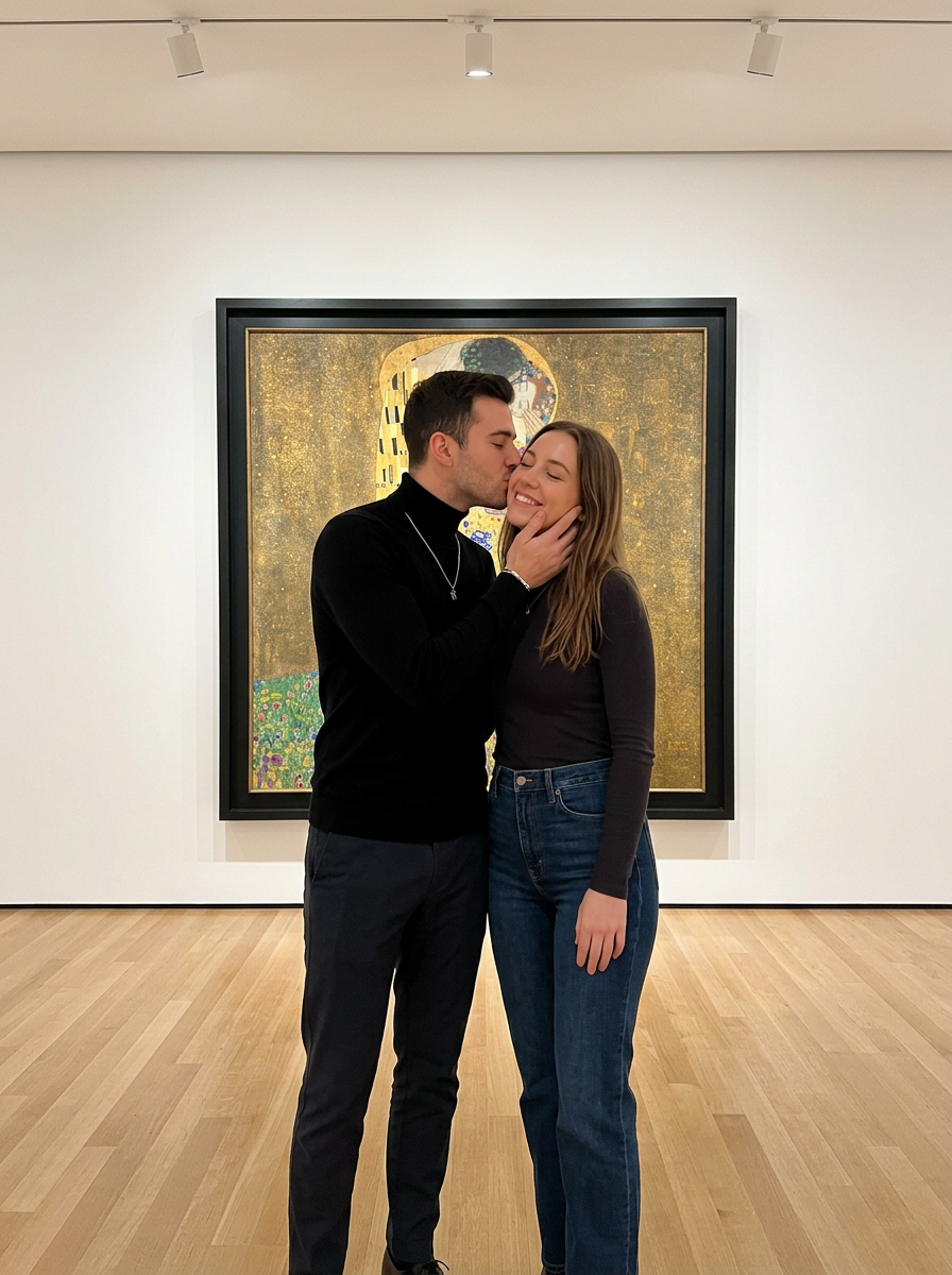 {"generation_request":{"meta_data":{"tool":"NanoBanana Pro","task_type":"photorealistic_couple_lifestyle_museum_scene","version":"v1.0_MUSEUM_KLIMT_KISS_POSE_LOCK","priority":"highest"},"references":{"reference_image_1":{"source":"UPLOAD_REFERENCE_IMAGE (REQUIRED)","purpose":"FULL_SCENE_COMPOSITION_LOCK","strict_lock":true,"no_layout_drift":true,"preserve_pose":true,"preserve_framing":true,"preserve_lighting_mood":true},"female_character_reference_image":{"source":"UPLOAD_FEMALE_REFERENCE (OPTIONAL)","purpose":"FEMALE_IDENTITY_LOCK","strict_identity_lock":true,"face_match_strength":"max","no_identity_drift":true},"male_character_reference_image":{"source":"UPLOAD_MALE_REFERENCE (OPTIONAL)","purpose":"MALE_IDENTITY_LOCK","strict_identity_lock":true,"face_match_strength":"max","no_identity_drift":true}},"output_settings":{"aspect_ratio":"2:3","orientation":"portrait","resolution":"ultra_high_res","render_style":"ultra_photoreal_lifestyle_editorial","sharpness":"crisp_but_natural","film_grain":"none_or_minimal","color_grade":"clean_gallery_neutral_warm"},"creative_prompt":{"scene_summary":"Recreate the reference image EXACTLY: an museum\/gallery moment in front of a large framed painting strongly resembling Gustav Klimt's 'The ' (gold mosaic style). The couple stands close, centered under the artwork. The model gently the model's cheek while holding her jaw\/cheek softly with his hand; the model smiles with eyes closed, relaxed and affectionate.\n\nWardrobe (match reference):\n- model: fitted black turtleneck, dark trousers, clean minimal jewelry (subtle chain\/pendant).\n- model: fitted dark long-sleeve top, high-waisted dark jeans; hair down and natural.\n\nEnvironment (match reference):\n- Large black frame around the painting; white gallery wall; soft overhead gallery lighting.\n- Realistic shadows on the wall and subtle floor\/wall reflections.\n\nCamera:\n- Natural smartphone \/ lifestyle photo feel but high quality.\n- Medium-full framing showing both subjects from upper legs to head, with the full framed artwork behind them.\n\nRealism:\n- Perfect anatomy (hands, fingers), natural skin texture, no plastic smoothing.\n- No added people, no extra objects, no text overlays, no watermark."},"hard_constraints":["Exactly two people only (one model + one model).","Pose and framing must match the reference image 100%.","Museum\/gallery background with large framed gold mosaic painting behind them.","Natural, affectionate cheek- moment with hand on jawline.","No text\/logos\/watermarks."],"negative_prompt":["extra people","missing people","wrong pose","different background","warped faces","identity drift (if identity references provided)","deformed hands\/fingers","cartoon, CGI, anime","text, logo, watermark","over-smoothed skin","blurry image"]}}