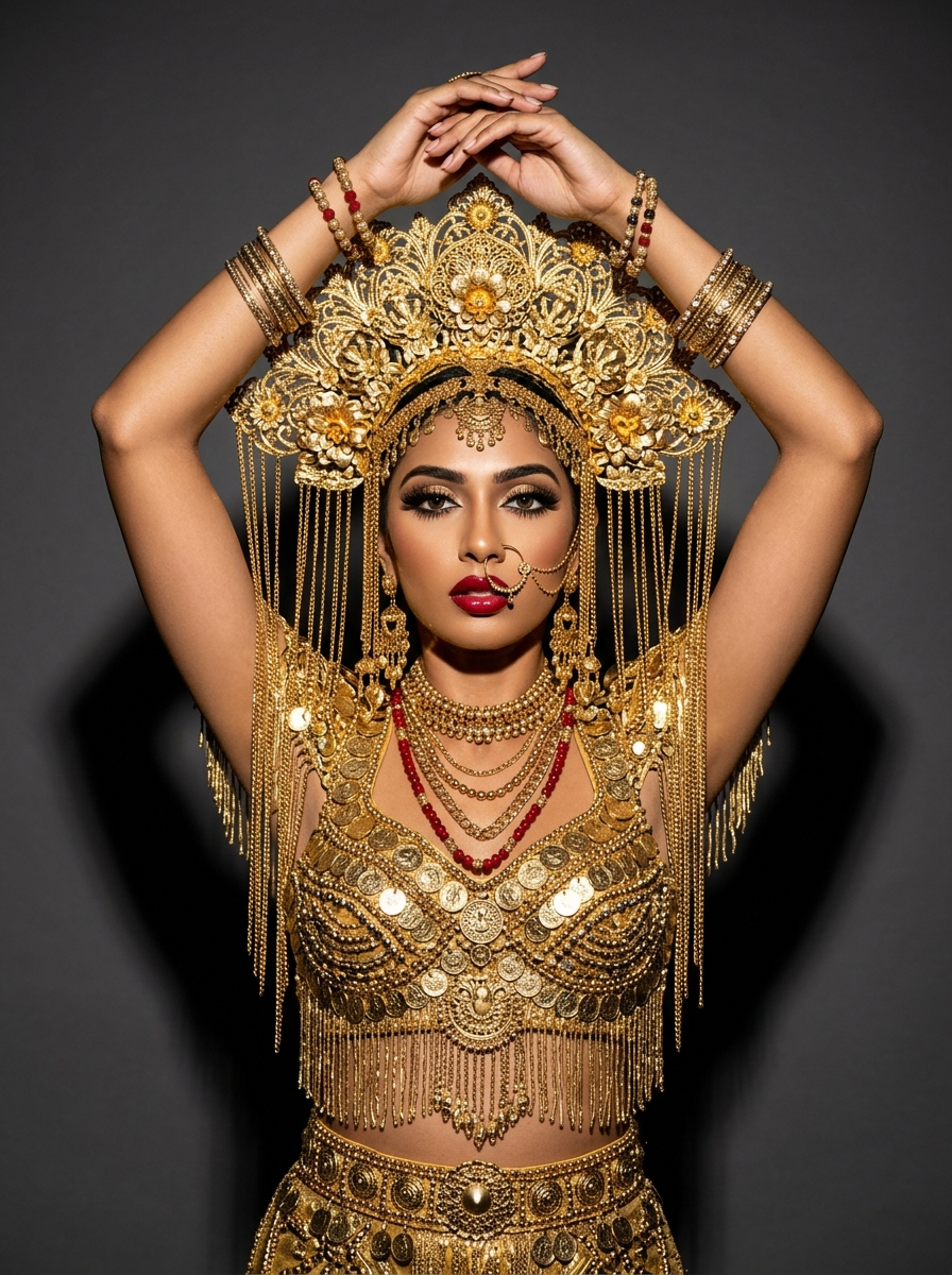 {"generation_request":{"meta_data":{"tool":"NanoBanana Pro","task_type":"text_to_image_photoreal_fashion_editorial","version":"v1.0","priority":"high"},"references":{"character_reference_image":"UPLOAD_YOUR_CHARACTER_REFERENCE (OPTIONAL_IF_YOU_WANT_SAME_PERSON)","reference_rules":{"if_character_reference_provided_then_preserve_identity":true,"identity_lock_strength":0.98,"do_not_copy_any_unprovided_identity":true}},"output_settings":{"aspect_ratio":"4:5","orientation":"portrait","resolution":"ultra_high_res","render_style":"photorealistic_high_flash_editorial","sharpness":"high","film_grain":"subtle"},"creative_prompt":{"scene_summary":"High-fashion studio editorial portrait inspired by ornate Southeast ceremonial regalia. Single model in a maximalist gold costume with heavy jewelry, dramatic makeup, and an elaborate crown-like headdress with dangling chains. Clean studio background with harsh direct flash for crisp shadows and sparkling specular highlights. No text\/logos\/watermarks.","subject":{"type":"adult_woman","pose":"front-facing, arms raised overhead with wrists crossed, hands resting above the crown; elegant symmetrical pose","expression":"calm, regal, slightly intense gaze","hair":"short blunt bob with straight bangs (or sleek hair hidden under headpiece)","makeup":{"style":"theatrical editorial","eyes":"bold eyeliner, heavy lashes, soft colored accents around eyes, high-contrast highlight","lips":"glossy deep red","skin":"porcelain-smooth but realistic texture, luminous highlights"}},"wardrobe":{"headpiece":"massive ornate gold crown\/headdress with intricate filigree, floral motifs, and long dangling gold chains framing the face and cascading down both sides","jewelry":["large decorative nose ring with a delicate chain detail","layered gold necklaces with red bead accents","heavy gold earrings ","multiple gold bangles and beaded bracelets","gold shoulder\/arm ornaments with fringe tassels"],"costume":"full gold embellished dress\/armor-like bodice covered in coins, medallions, filigree plates, beadwork, and shimmering fringe; red bead accents throughout; ornate waist belt; dense sparkling texture"},"environment":{"background":"pure seamless studio backdrop","floor":"not or minimal","props":"none"},"lighting_and_camera":{"lighting":"harsh direct on-camera flash, strong crisp shadow behind subject, high contrast, specular sparkle on gold, slight overflash highlights but controlled","camera":"high-end editorial shot with point-and-shoot flash vibe","lens":"50mm (full-frame look)","aperture":"f\/5.6","iso":"200","shutter":"1\/160","focus":"sharp eyes and facial jewelry; crisp detail on gold textures; background clean"},"composition":{"framing":"mid-to-full body portrait (waist to head), centered subject, headpiece and dangling chains fully in frame","style_notes":"maximalist luxury, museum-like regalia, couture editorial, highly detailed gold surfaces"},"strict_rules":["NO text","NO logos","NO watermark","single subject only","background only","keep the costume extremely ornate and gold-heavy with dangling chains","avoid cultural caricature; keep it respectful couture\/editorial styling"]},"negative_prompt":["text","logo","watermark","extra people","blurry face","low resolution","cheap plastic jewelry","missing hands","bad hands, fused fingers, extra fingers","messy background, studio gear ","muted dull gold (must be shiny)","over-smoothed plastic skin"]}}