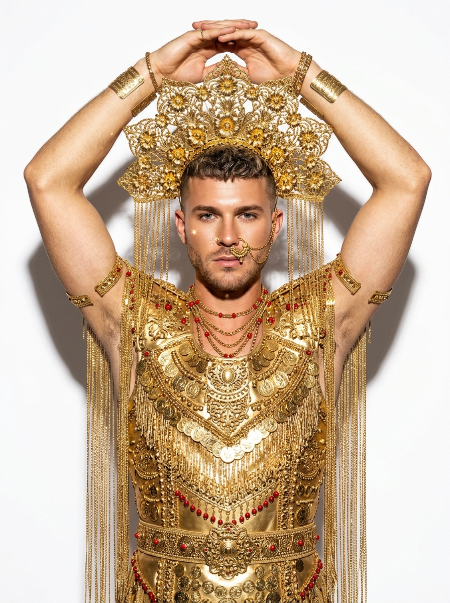 {"generation_request":{"meta_data":{"tool":"NanoBanana Pro","task_type":"text_to_image_photoreal_fashion_editorial","version":"v1.0","priority":"high"},"references":{"character_reference_image":"UPLOAD_YOUR_CHARACTER_REFERENCE (OPTIONAL_IF_YOU_WANT_SAME_PERSON)","reference_rules":{"if_character_reference_provided_then_preserve_identity":true,"identity_lock_strength":0.98,"do_not_copy_any_unprovided_identity":true}},"output_settings":{"aspect_ratio":"4:5","orientation":"portrait","resolution":"ultra_high_res","render_style":"photorealistic_high_flash_editorial","sharpness":"high","film_grain":"subtle"},"creative_prompt":{"scene_summary":"High-fashion studio editorial portrait inspired by ornate Southeast ceremonial regalia. Single model in a maximalist gold costume with heavy jewelry, groomed features, and an elaborate crown-like headdress with dangling chains. Clean studio background with harsh direct flash for crisp shadows and sparkling specular highlights. No text\/logos\/watermarks.","subject":{"type":"adult_man","pose":"front-facing, arms raised confidently overhead with hands clasped above the headpiece; strong symmetrical pose","expression":"calm, regal, intense gaze","hair":"short textured crop with clean lines (or hair hidden under headpiece)","makeup":{"style":"editorial minimal","eyes":"sharp defined brows, intense gaze","lips":"natural","skin":"groomed with light stubble, realistic texture, luminous highlights"}},"wardrobe":{"headpiece":"massive ornate gold crown\/headdress with intricate filigree, floral motifs, and long dangling gold chains framing the face and cascading down both sides","jewelry":["large decorative nose stud with a delicate chain detail","layered gold chains with red bead accents","small gold studs","multiple gold cuffs and beaded bracelets","gold shoulder\/arm ornaments with fringe tassels"],"costume":"full gold embellished armor-like tunic covered in coins, medallions, filigree plates, beadwork, and shimmering fringe; red bead accents throughout; ornate waist belt; dense sparkling texture"},"environment":{"background":"pure seamless studio backdrop","floor":"not or minimal","props":"none"},"lighting_and_camera":{"lighting":"harsh direct on-camera flash, strong crisp shadow behind subject, high contrast, specular sparkle on gold, slight overflash highlights but controlled","camera":"high-end editorial shot with point-and-shoot flash vibe","lens":"50mm (full-frame look)","aperture":"f\/5.6","iso":"200","shutter":"1\/160","focus":"sharp eyes and facial jewelry; crisp detail on gold textures; background clean"},"composition":{"framing":"mid-to-full body portrait (waist to head), centered subject, headpiece and dangling chains fully in frame","style_notes":"maximalist luxury, museum-like regalia, couture editorial, highly detailed gold surfaces"},"strict_rules":["NO text","NO logos","NO watermark","single subject only","background only","keep the costume extremely ornate and gold-heavy with dangling chains","avoid cultural caricature; keep it respectful couture\/editorial styling"]},"negative_prompt":["text","logo","watermark","extra people","blurry face","low resolution","cheap plastic jewelry","missing hands","bad hands, fused fingers, extra fingers","messy background, studio gear ","muted dull gold (must be shiny)","over-smoothed plastic skin"]}}