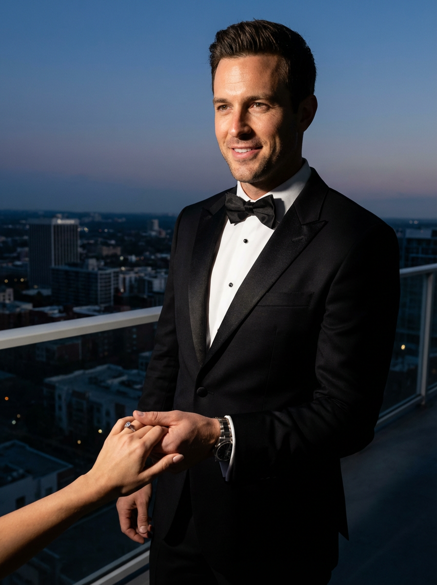 Glamorous engagement photoshoot with dramatic lighting. Model wearing a tuxedo with a stylish watch . Hollywood-style, luxury aesthetic.