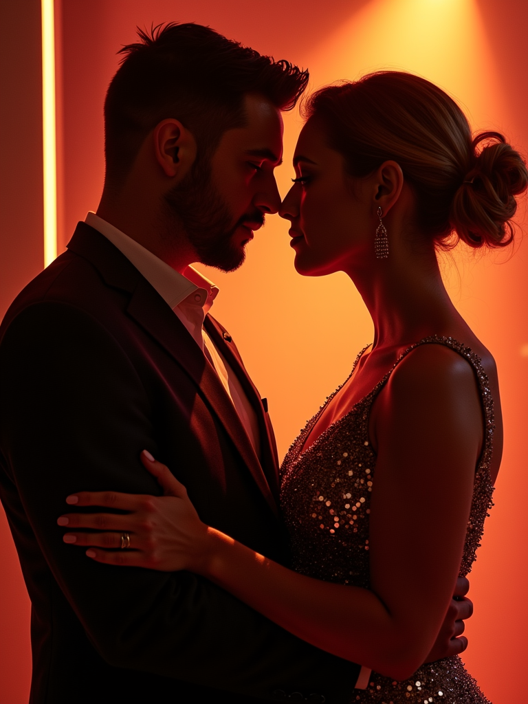Glamorous engagement photoshoot with dramatic lighting. Wearing a sequin-styled dress, high-fashion hair and makeup . Hollywood-style, luxury aesthetic.