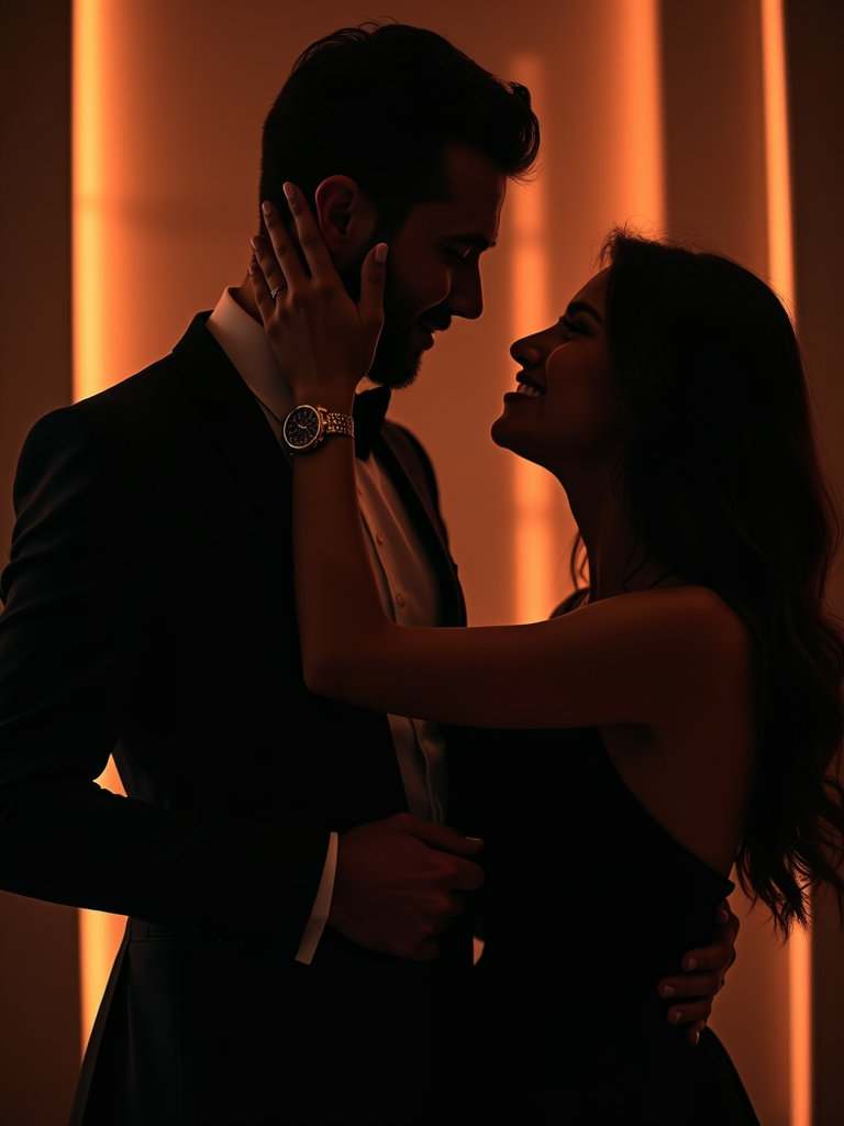 Glamorous engagement photoshoot with dramatic lighting. Wearing a tuxedo with a stylish watch . Hollywood-style, luxury aesthetic.
